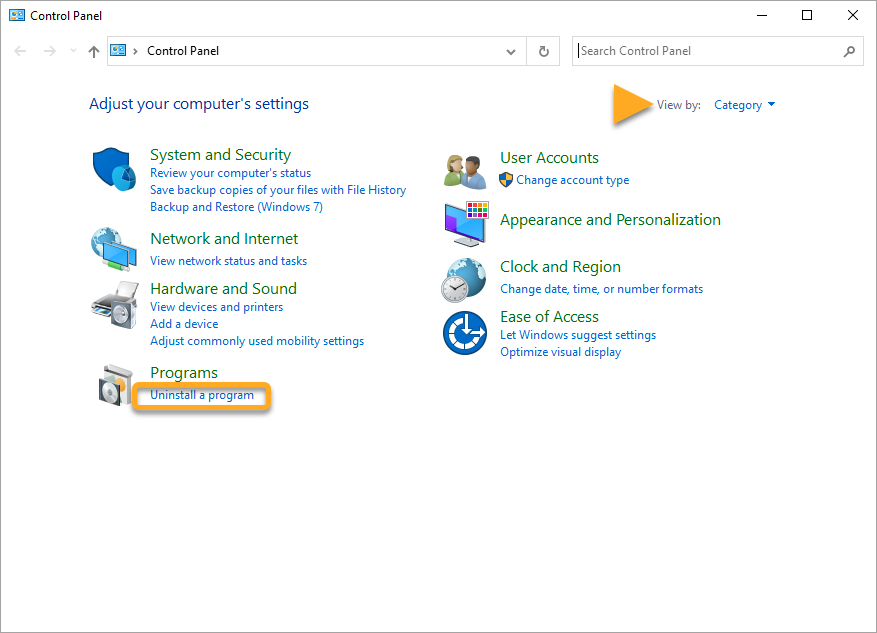 3. If your default view is set as Category, select Uninstall a program in the Programs panel. ...or if your default view is set as Icons, select Programs and Features.