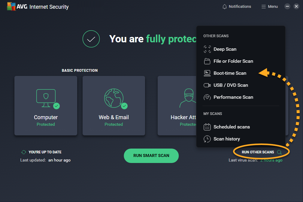 1. Open AVG Antivirus and select Run other scansBoot-time Scan.