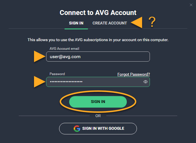 If you do not have an AVG Account, select the Create account tab to create a new AVG Account with the same email address that you used to purchase AVG Battery Saver.