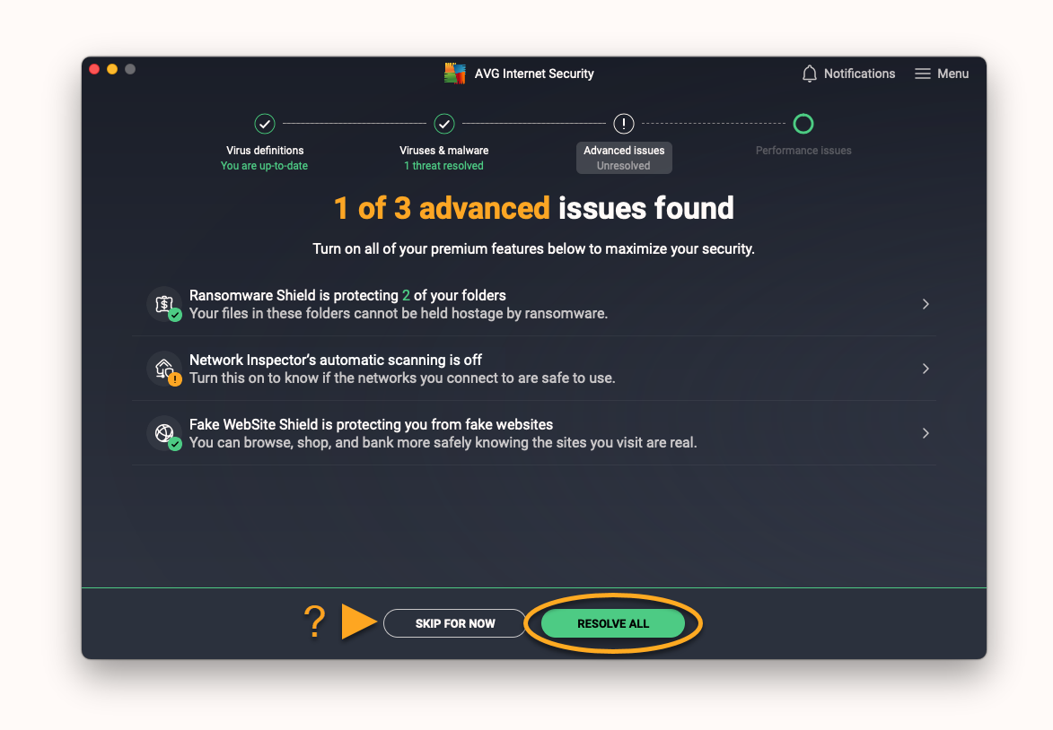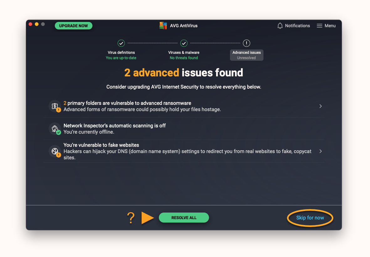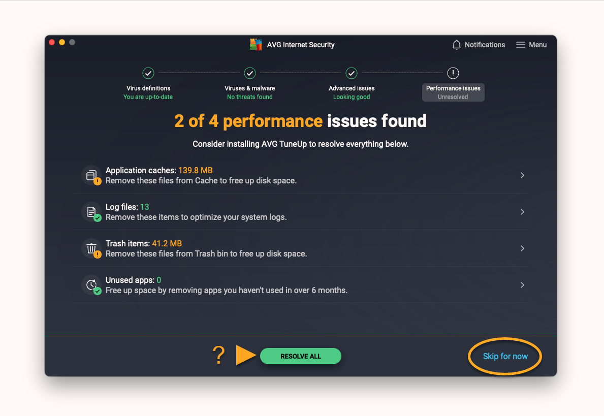 - Performance issues found: if you already have AVG TuneUp installed on your Mac, or you would like to purchase this product, click Resolve all. Otherwise, click Skip for now to proceed to the next screen.