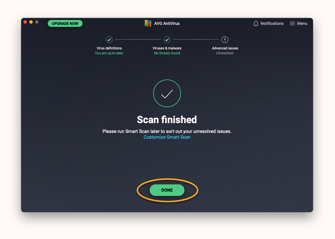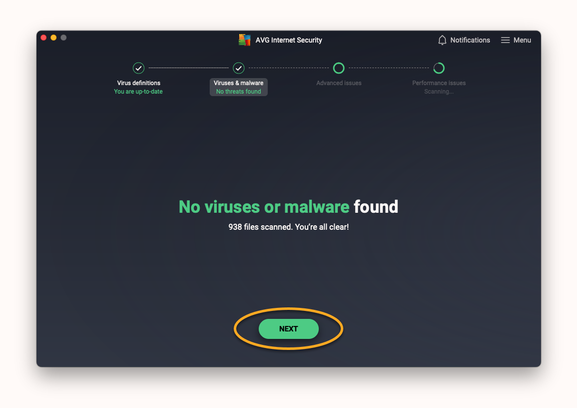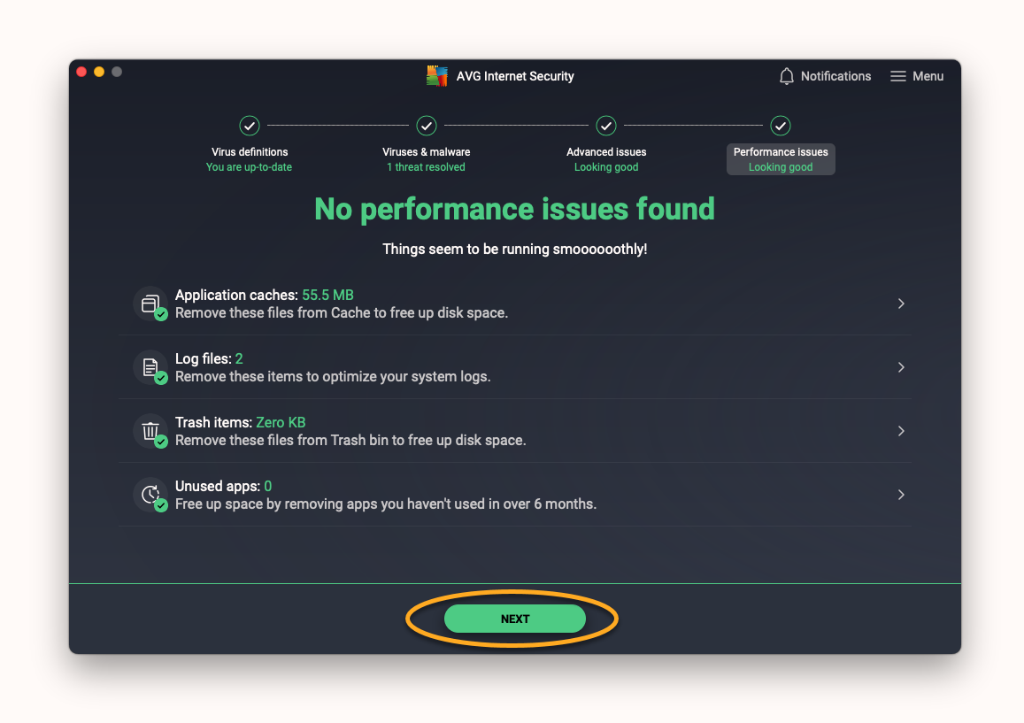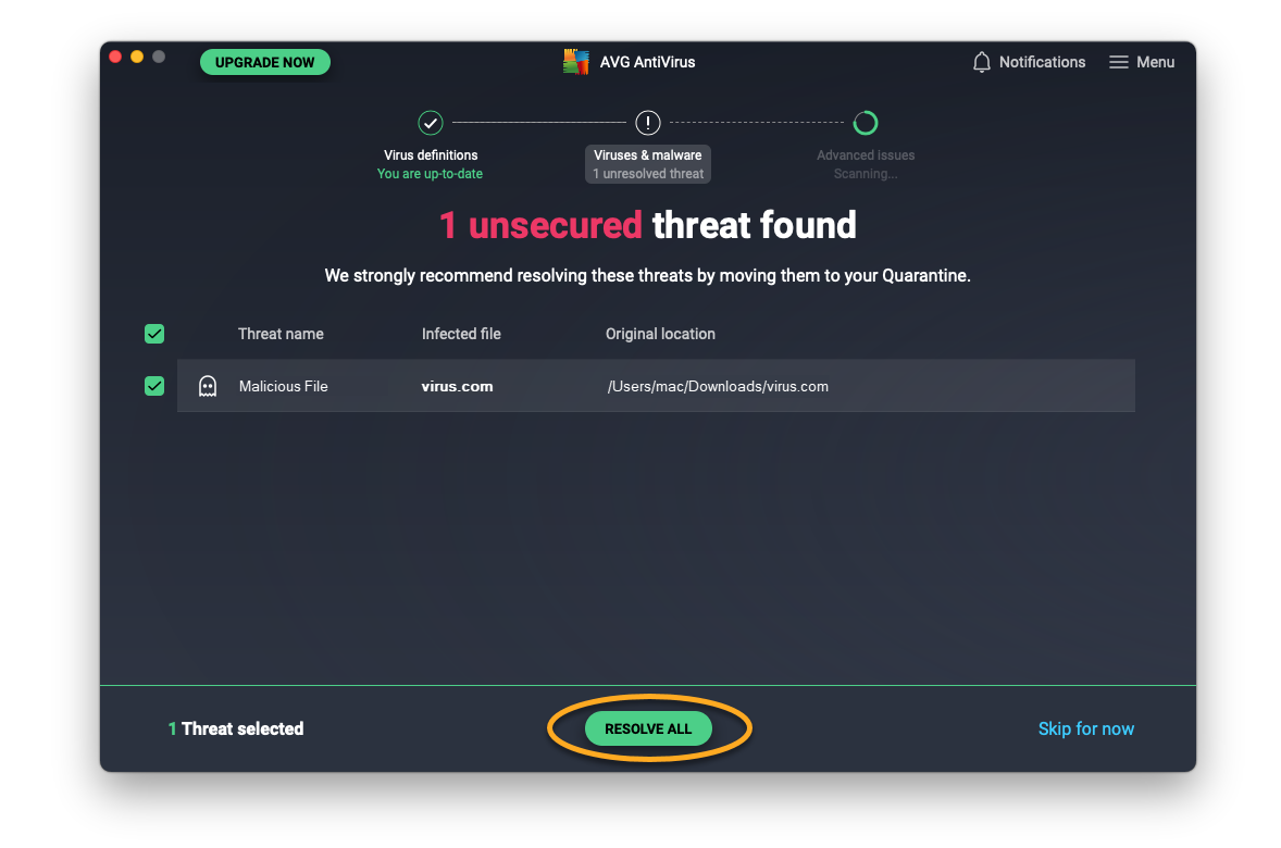 - Performance issues found: if you already have AVG TuneUp installed on your Mac, or you would like to purchase this product, click Resolve all. Otherwise, click Skip for now to proceed to the next screen.