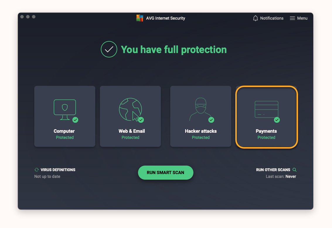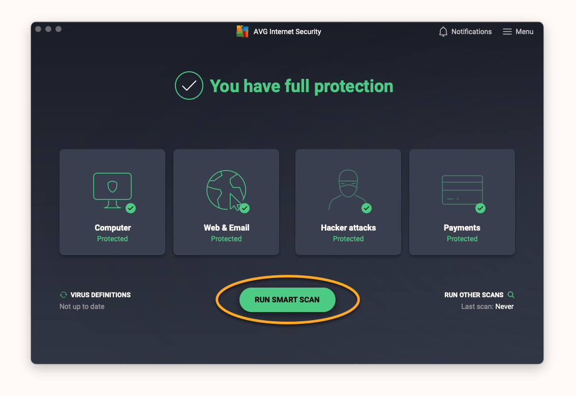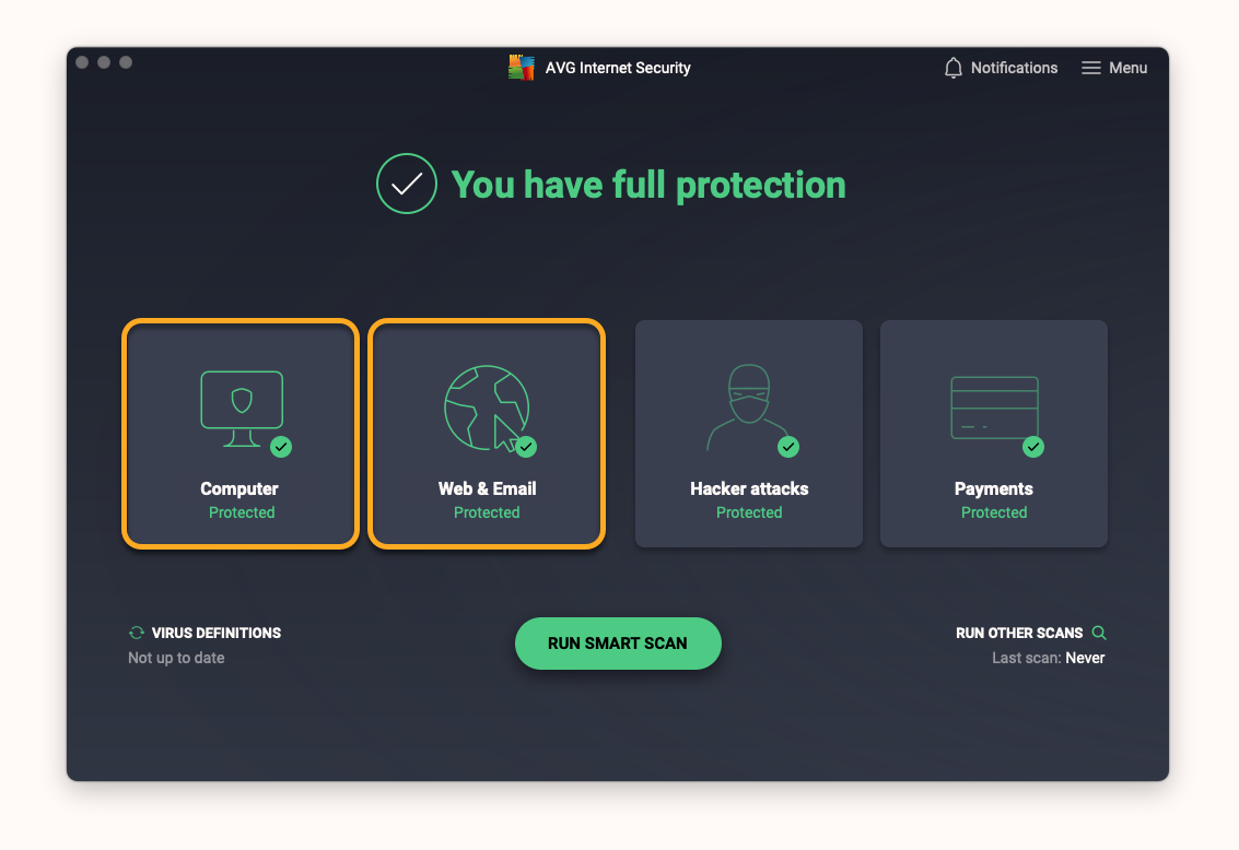 When all available features are enabled, and the application and virus definitions are up-to-date, you see the status message You have full protection.