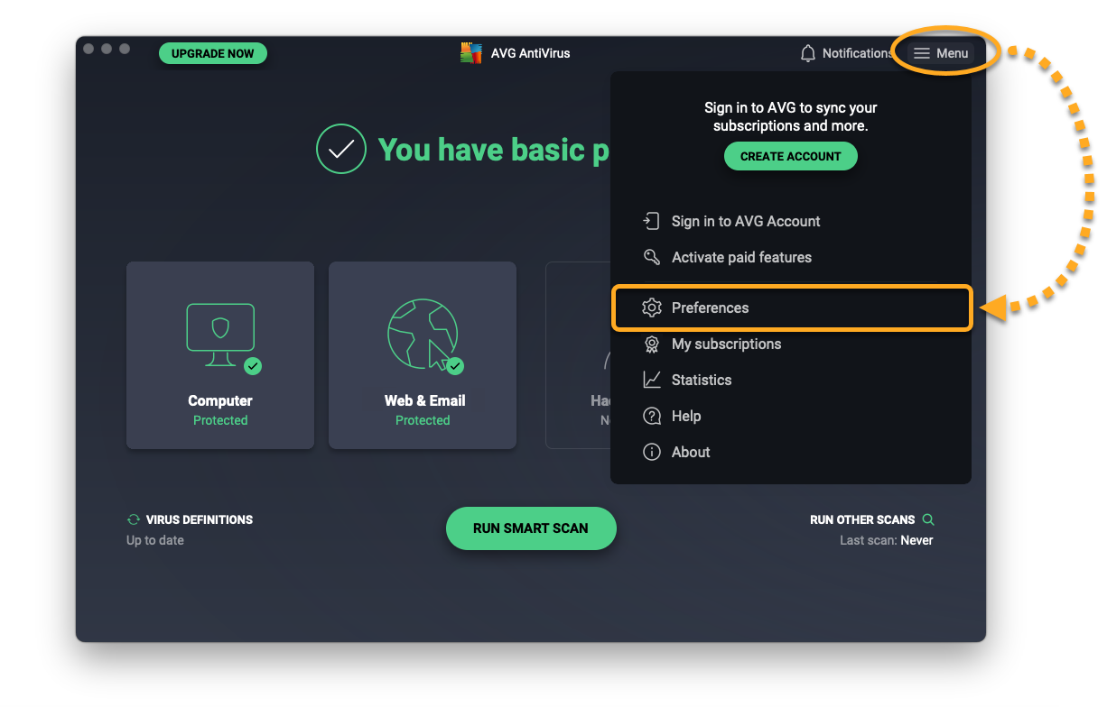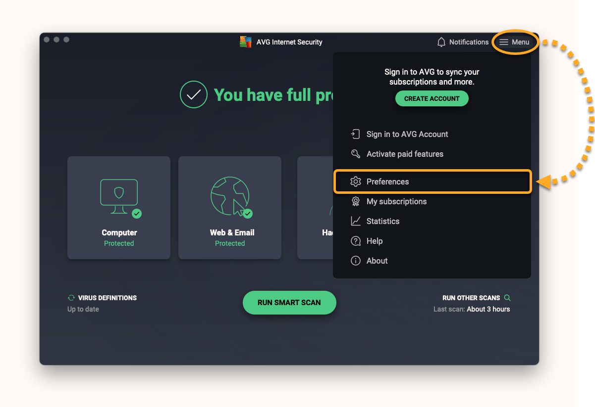 - Click the AVG Internet Security icon in the Apple menu bar and select Open AVG Internet Security.