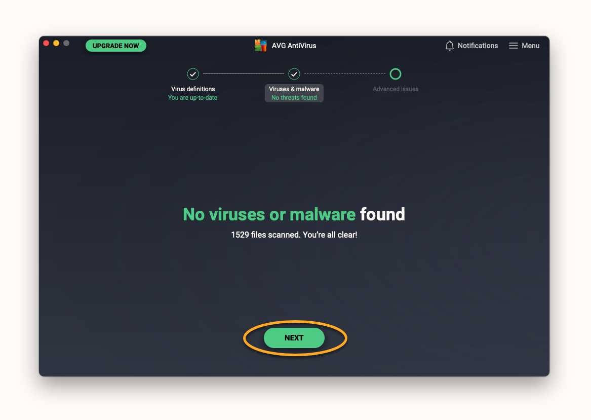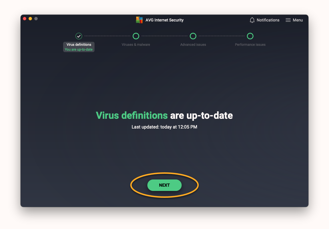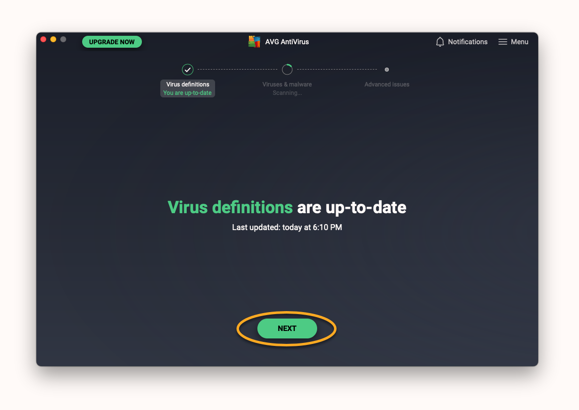 - Virus definitions are up-to-date: click Next to proceed to the next screen.