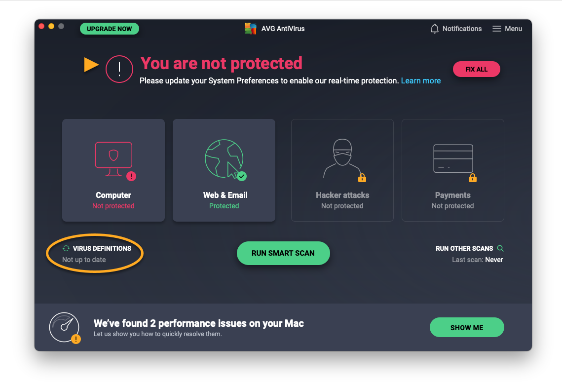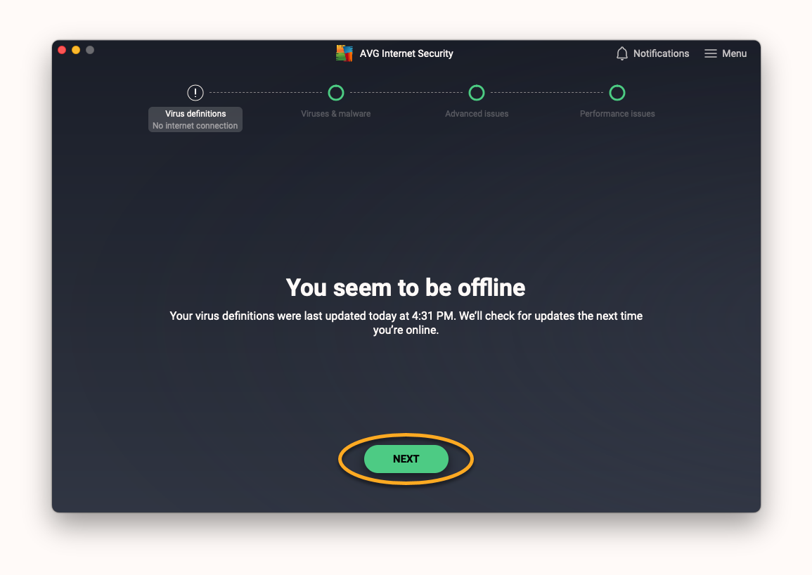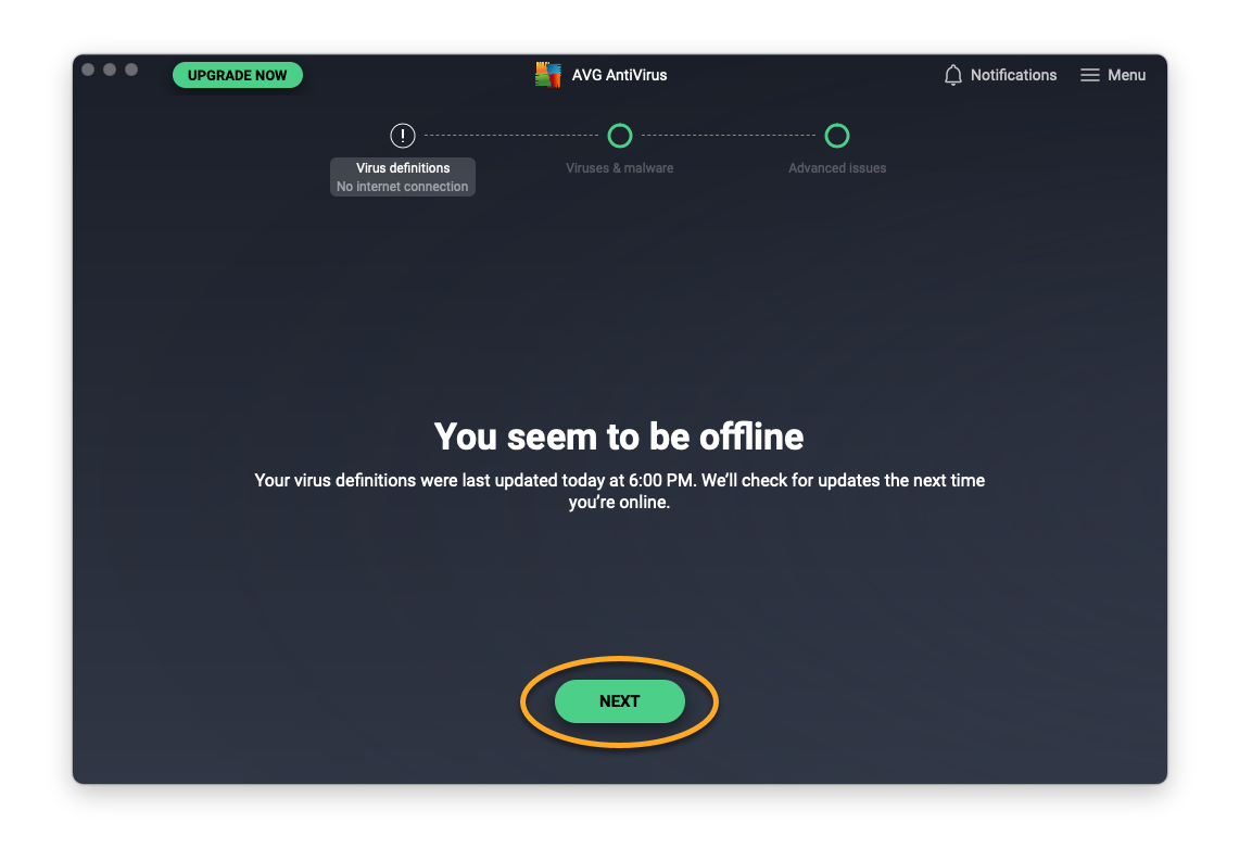 - You seem to be offline: AVG AntiVirus cannot update the virus definitions if you are not connected to the internet. Click Next to proceed with the Smart Scan. AVG AntiVirus will update your virus definitions the next time you connect to the internet.