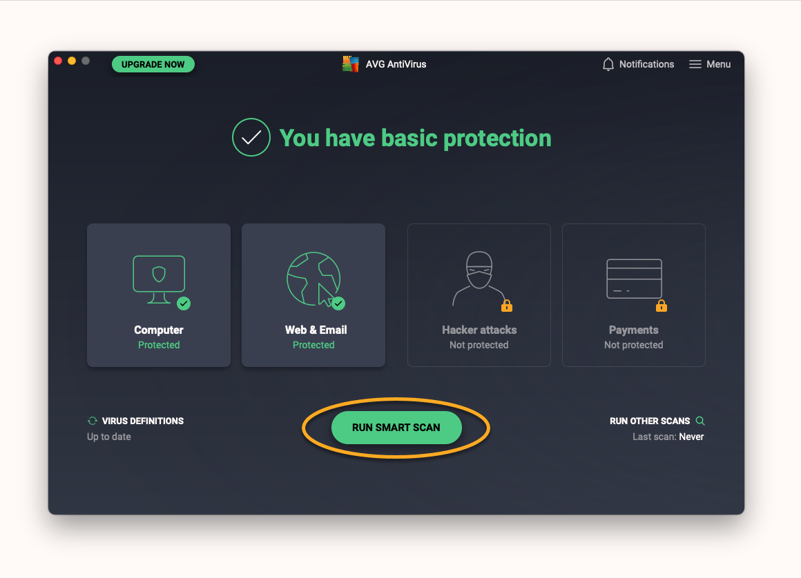 When you open AVG AntiVirus, the status message indicates if you need to take any action to protect your Mac.