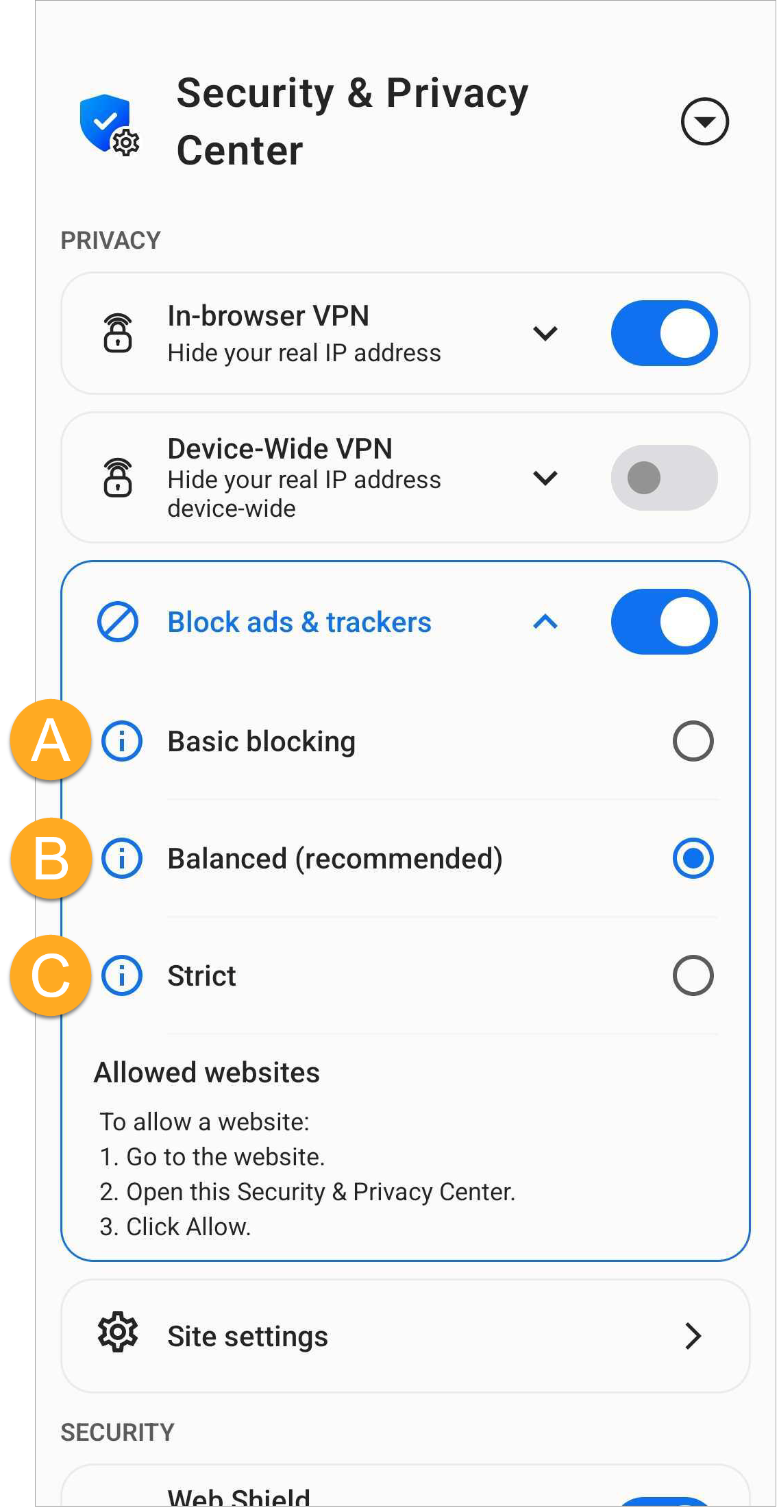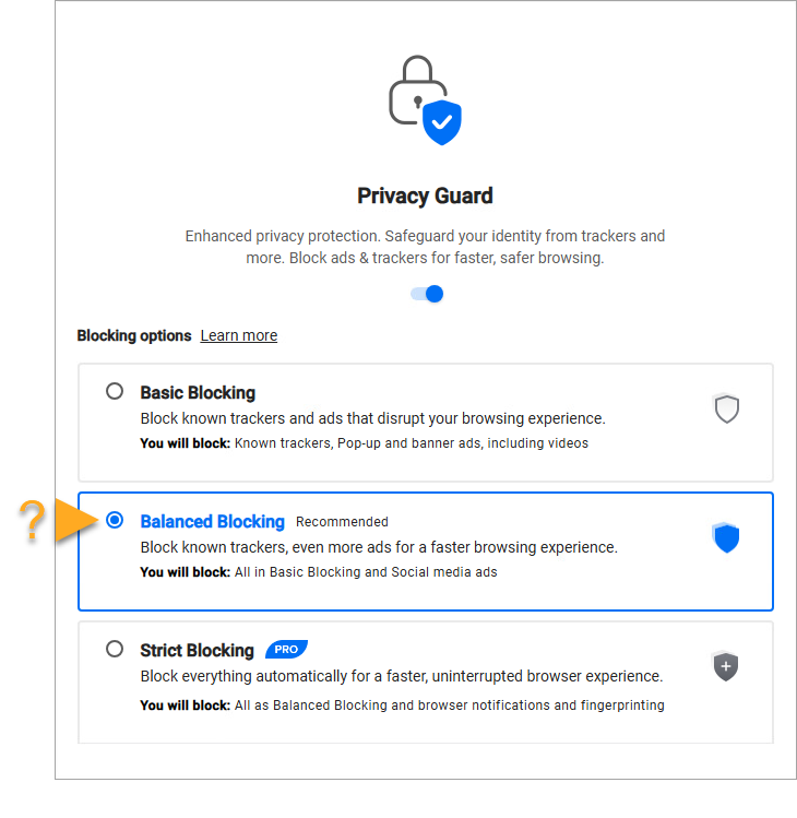 - Balanced (Recommended): Blocks most ads to improve the speed and safety of your browsing sessions. This includes pop-ups, banners, auto-playing videos, and some social media ads. Some ads that are helpful when searching online will still show in this mode.