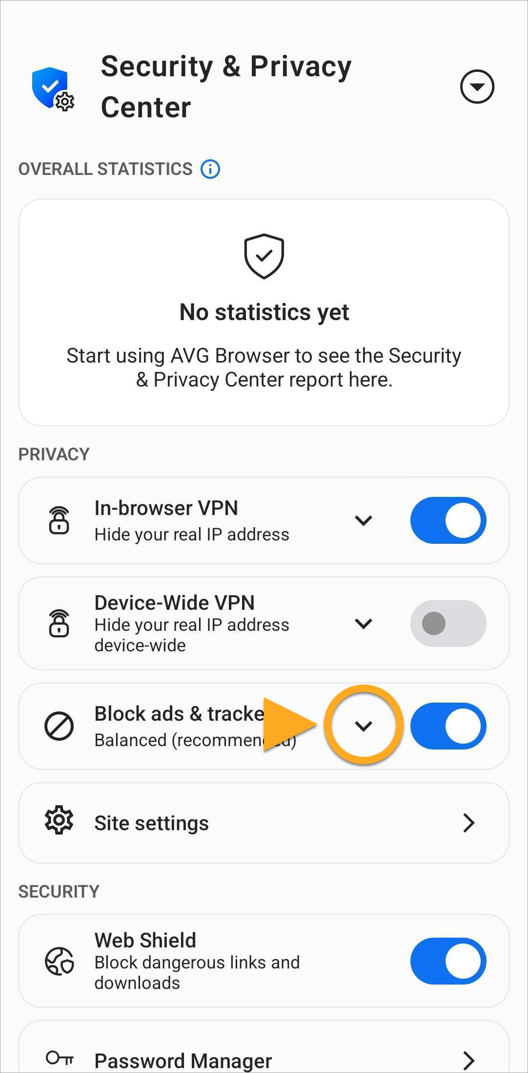 - Tap the down arrow next to Block ads & trackers.