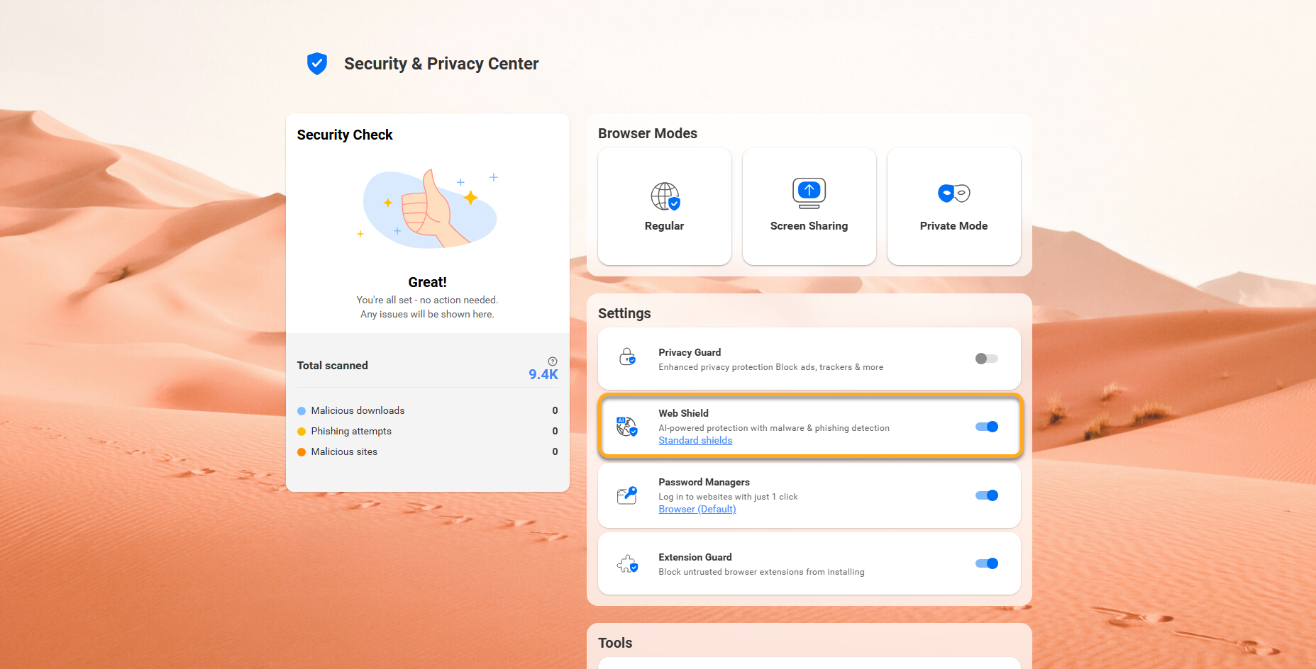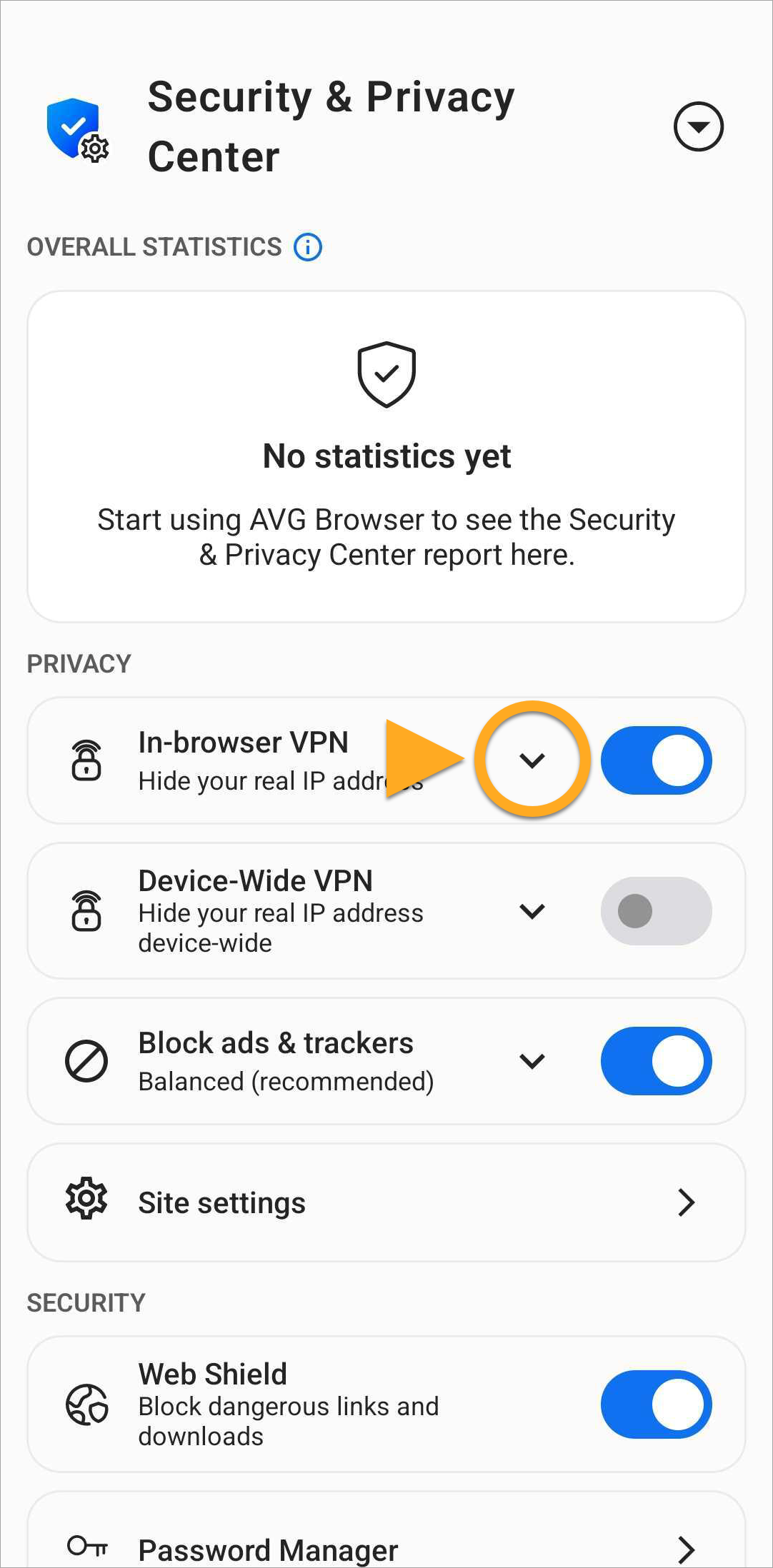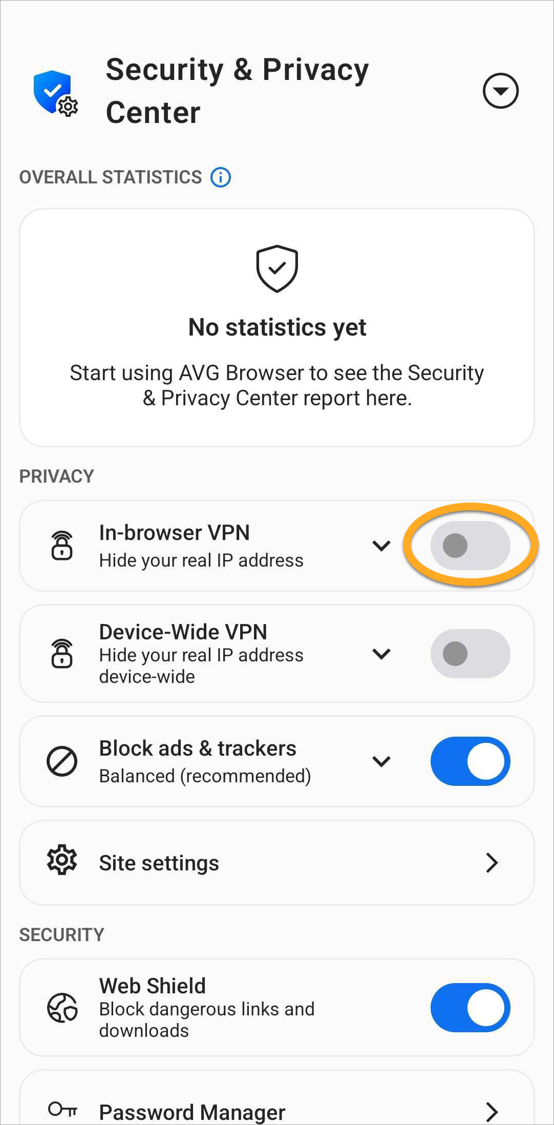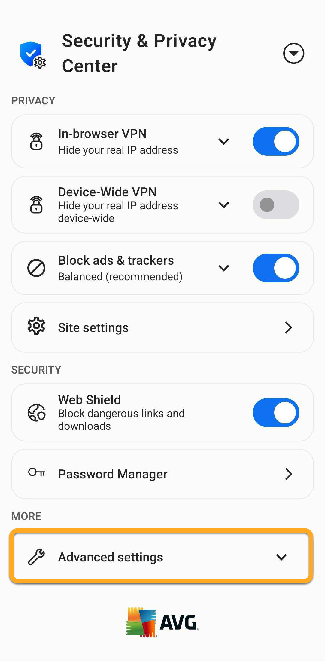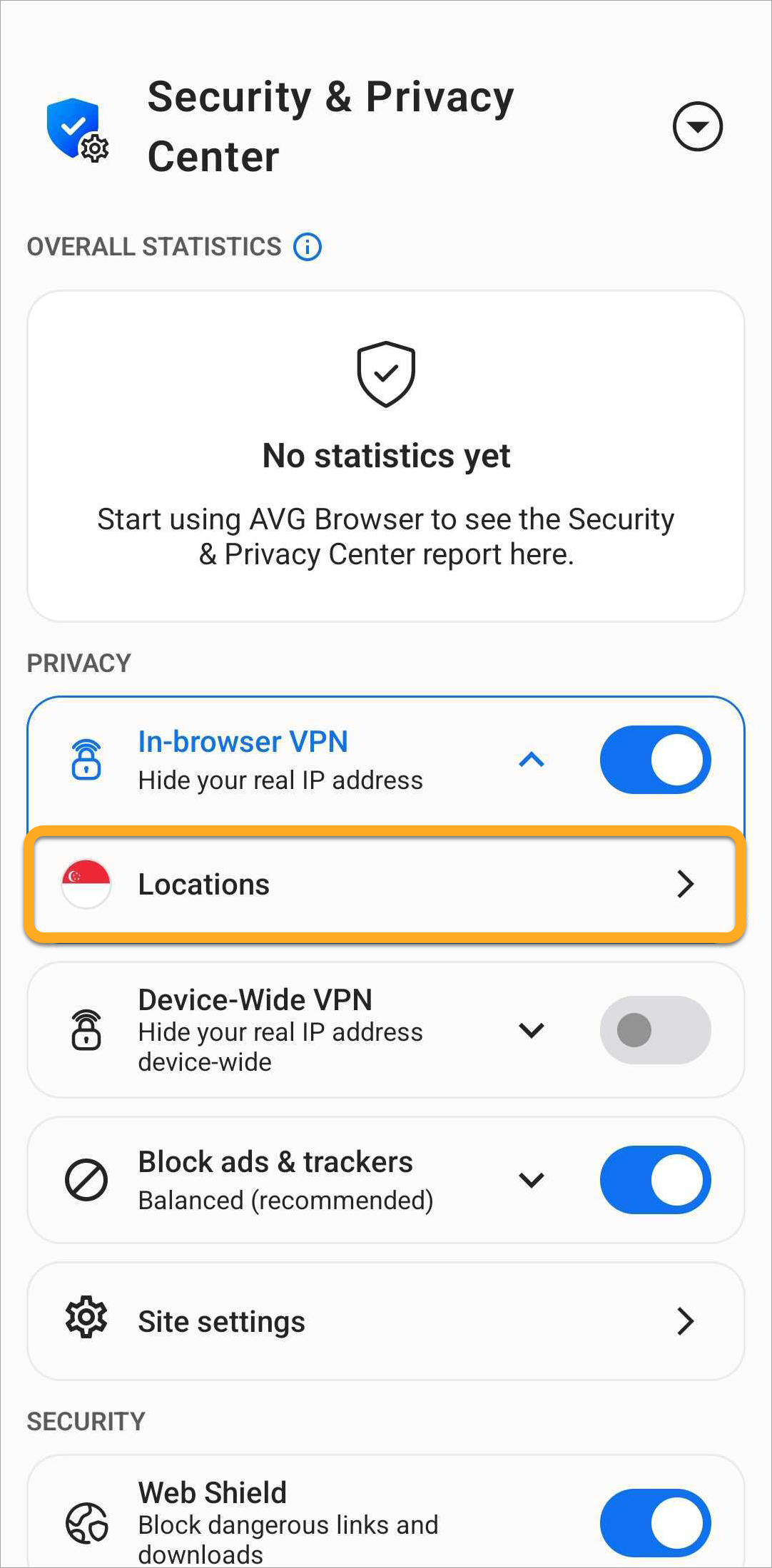 Most features are enabled by default to offer our highest level of security and privacy. Through the Security & Privacy Center, you can personalize AVG Secure Browser by manually enabling or disabling certain features. You can also access tools such as Private Mode, Privacy Cleaner, and Hack Check.