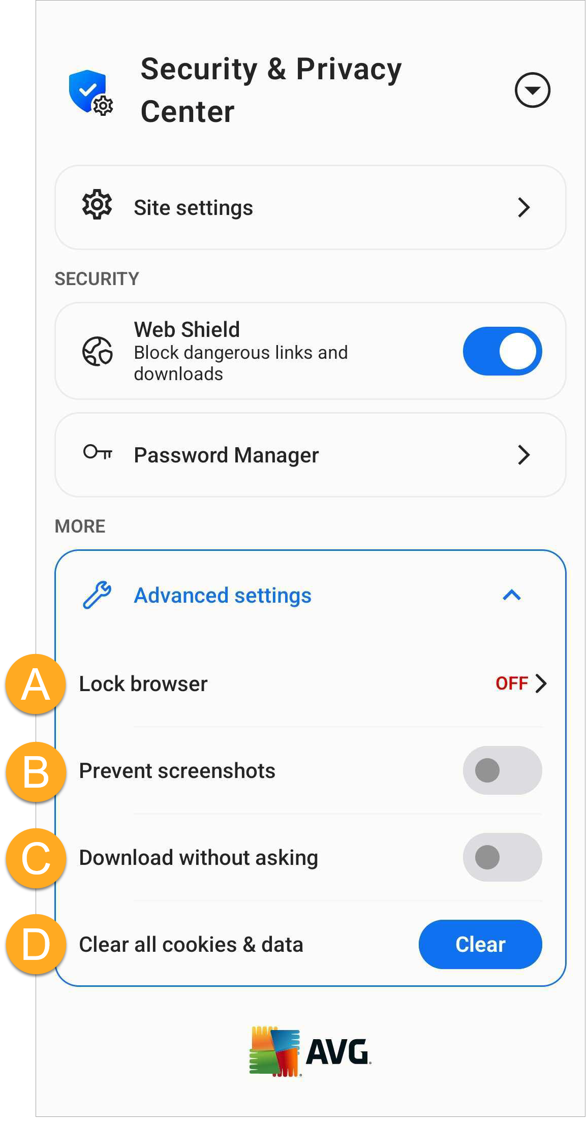 - Device-Wide VPN: Allow all of the apps on your device to connect more securely to the internet via AVG VPN servers (available in AVG Secure Browser PRO).