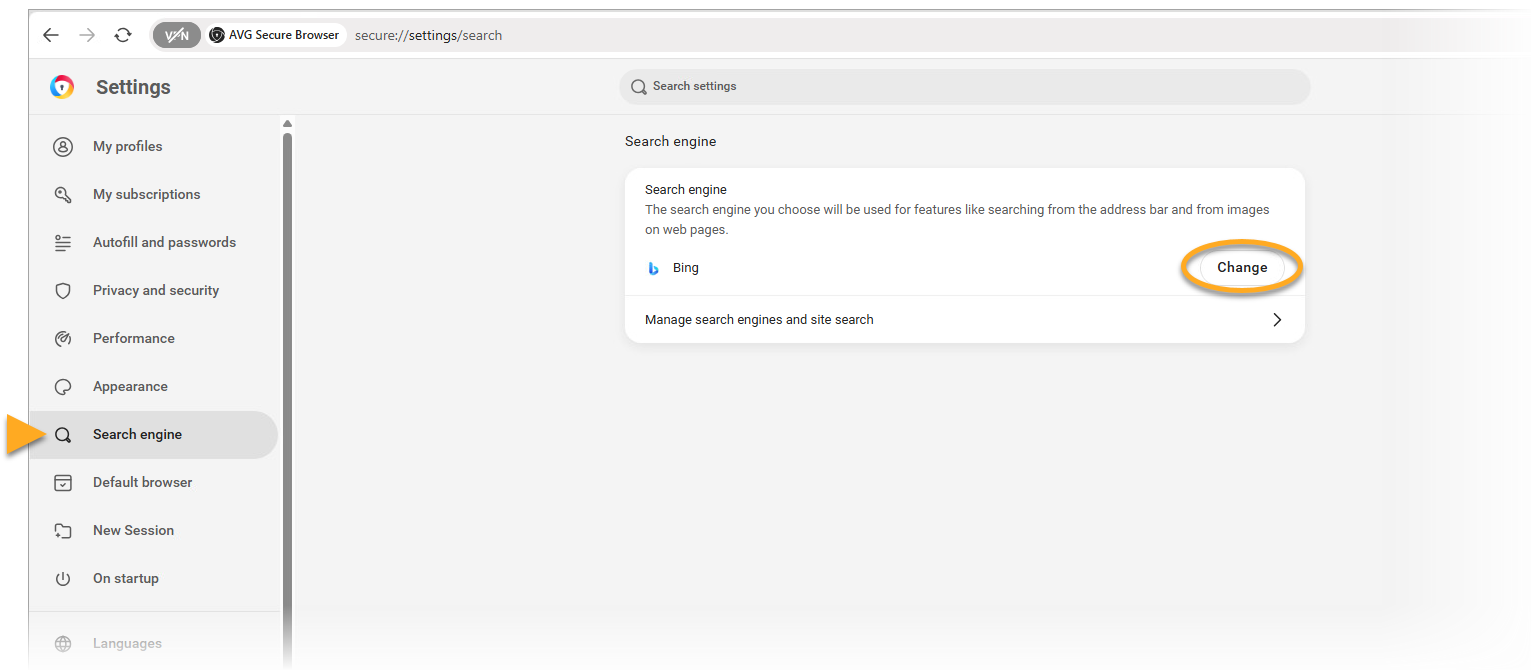 To change your AVG Secure Browser search engine: