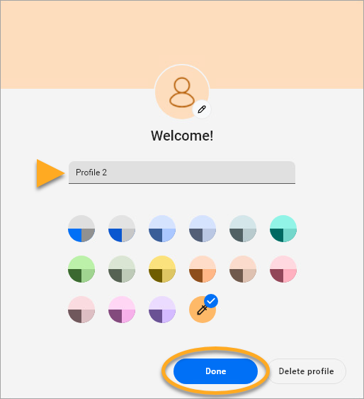 - Enter a name or a label. Optionally, choose your avatar and theme. Click Done when finished.