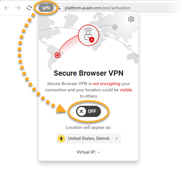 - Open AVG Secure Browser and click the VPN icon to the left of the address bar, then click the gray (OFF) slider so that it changes to blue (ON).