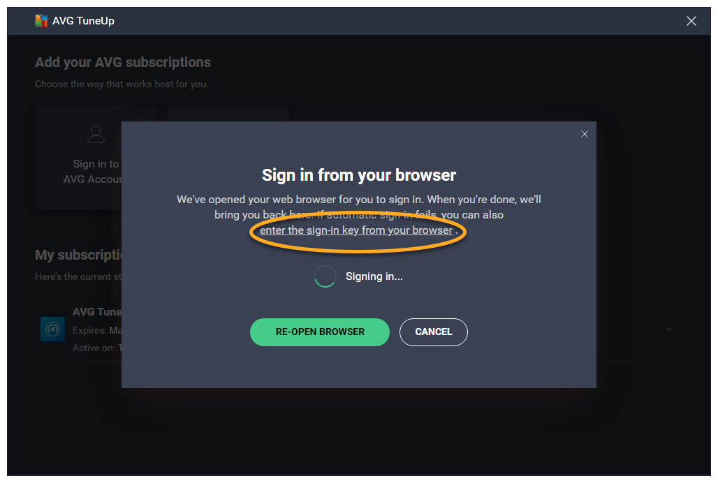 - Vaya a AVG TuneUp y haga clic en introducir la clave de acceso desde el navegador.
