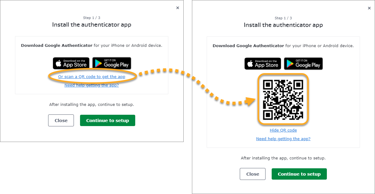 - Haga clic en Continuar con la configuración en la pantalla de instrucciones, después escanee el código QR con su dispositivo Android o iOS.
