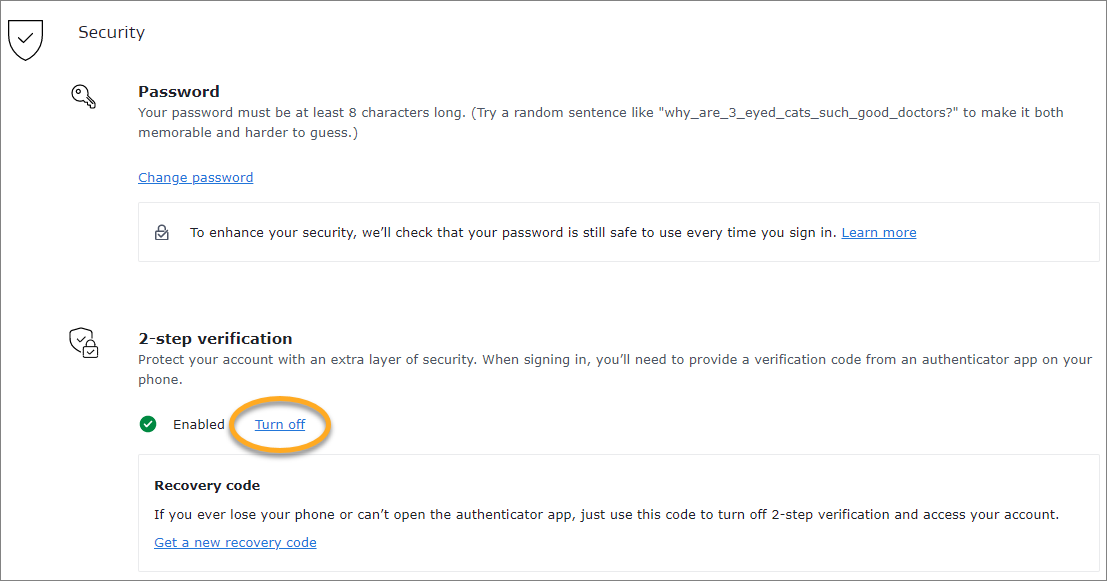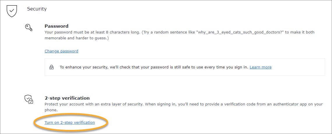 - En Seguridad, haga clic en Activar la verificación de dos factores.