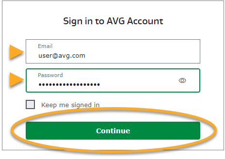 - Introduzca las credenciales de su cuenta AVG y haga clic en Continuar.