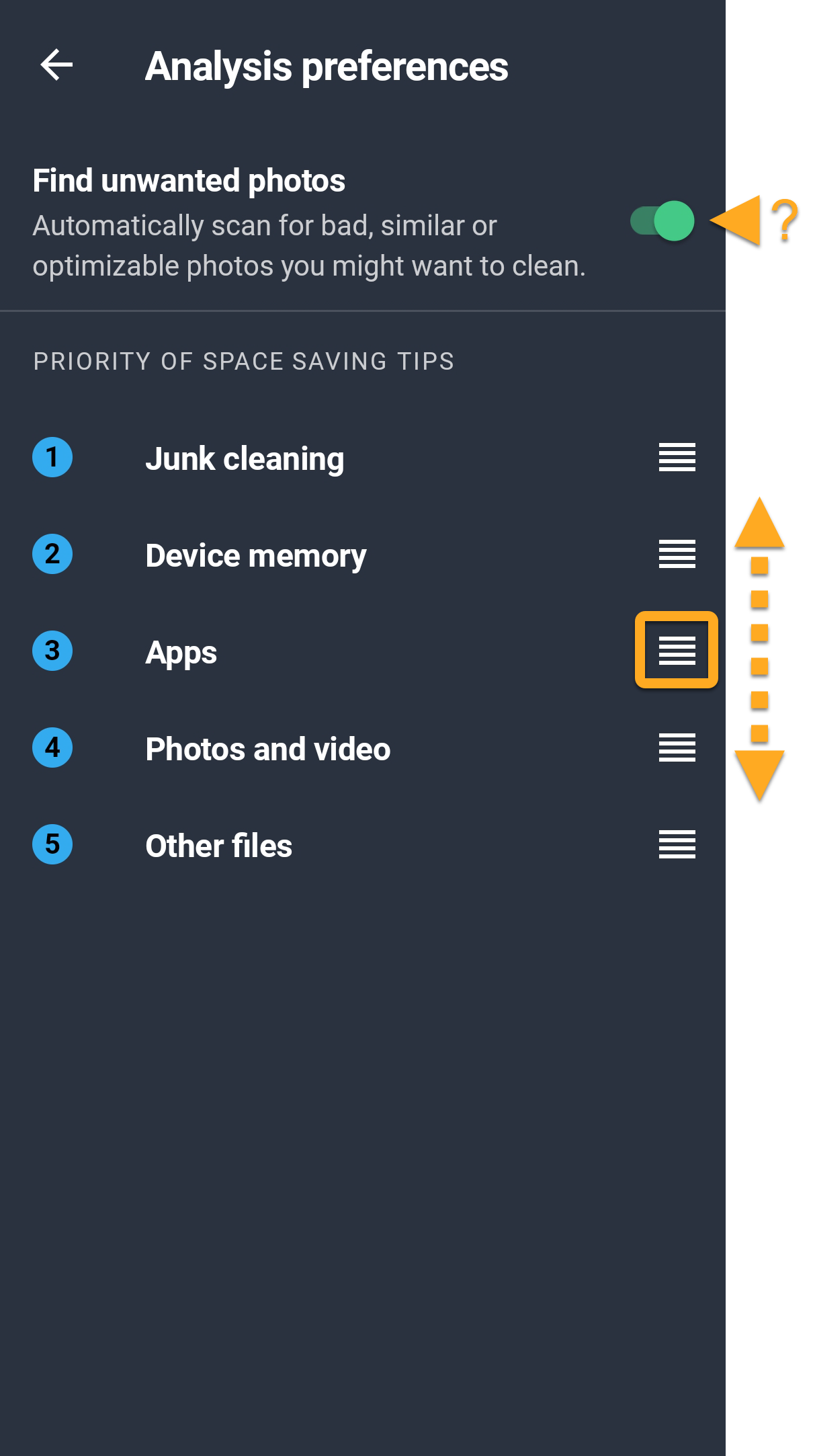(cuatro rayas) situado junto a una categoría de consejos y arrastre el panel hacia arriba o hacia abajo de acuerdo con sus preferencias. Si lo desea, toque el control deslizante situado junto a Buscar fotos no deseadas para activar (verde) o desactivar (gris) esta función.