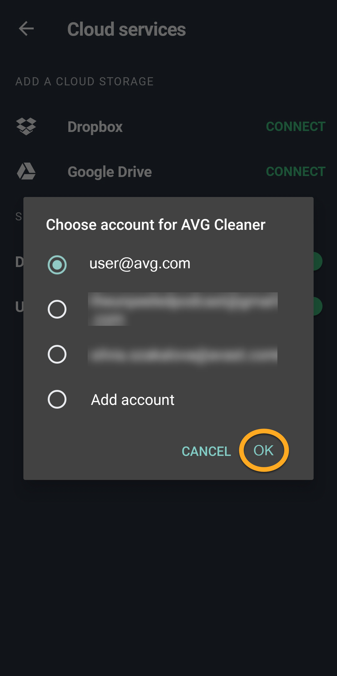 - Enviar originales al almacenamiento en la nube: elimina las fotos originales del dispositivo y las envía al almacenamiento en la nube. Si AVG Cleaner ya está conectado a una cuenta de almacenamiento en la nube, toque la dirección de correo electrónico conectada a la cuenta que prefiera. De lo contrario, toque Conectar a almacenamiento en la nube para conectar la aplicación a una nueva cuenta de almacenamiento en la nube.