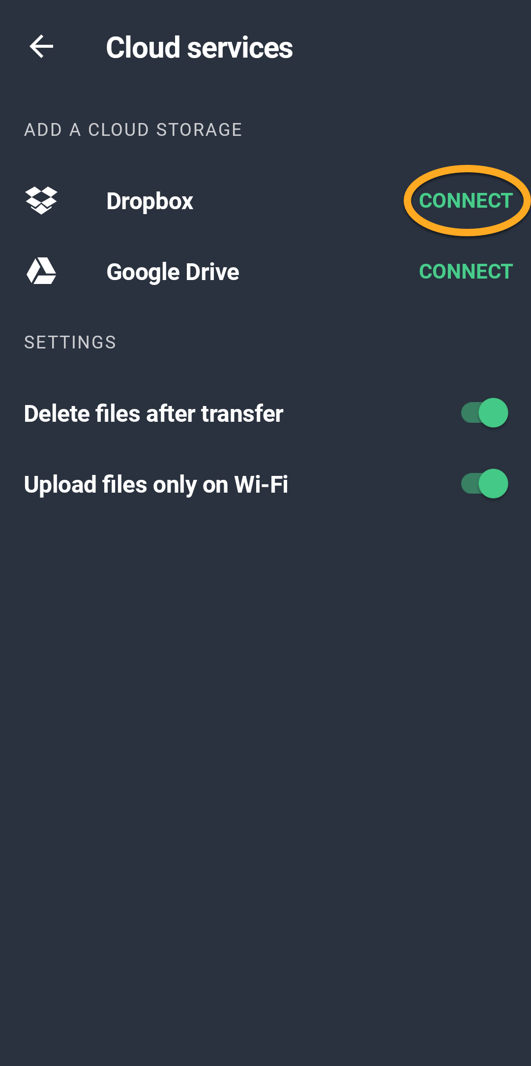 - Toque Conectar junto al servicio de nube elegido (Dropbox o Google Drive).