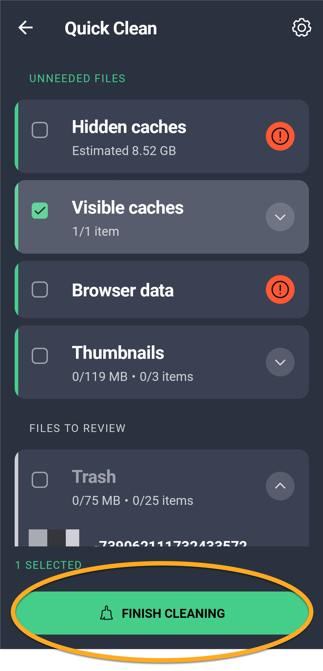 Limpieza rápida elimina los archivos innecesarios para liberar espacio de almacenamiento de su dispositivo y, así, limpiarlo. Antes de la limpieza puede seleccionar qué tipos de elemento se eliminarán.