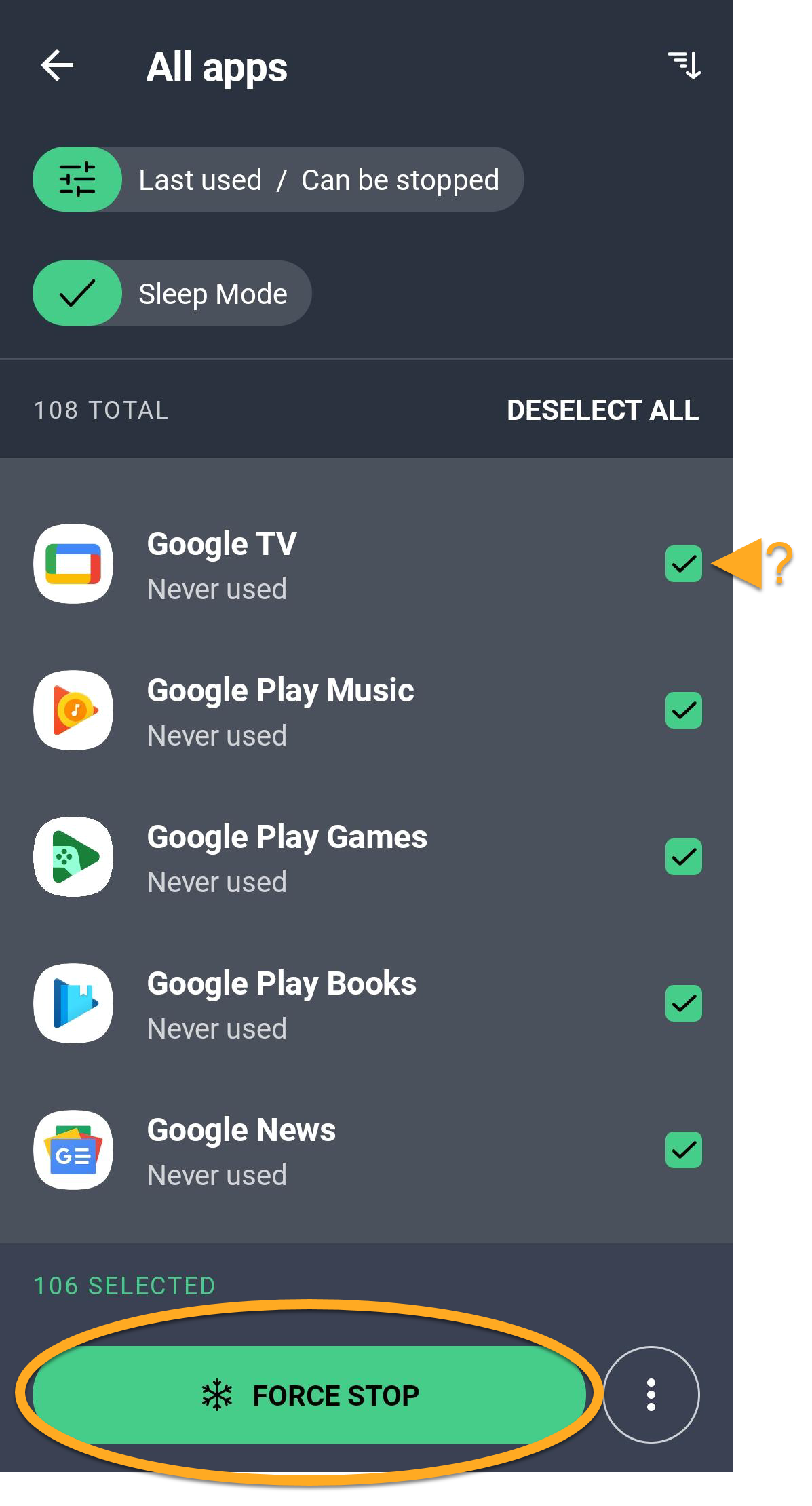 - Marque las aplicaciones que desea detener y toque Forzar detención.