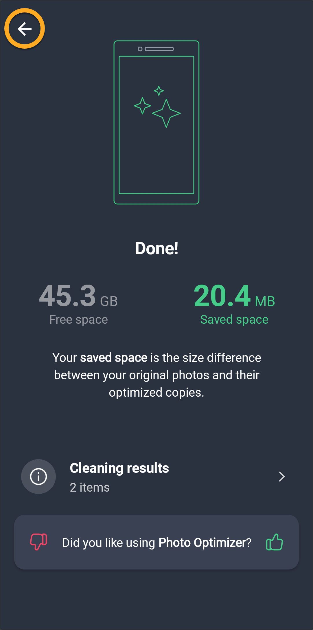 - Una vez que se complete la optimización, toque la flecha hacia atrás para volver a la pantalla principal de AVG Cleaner.