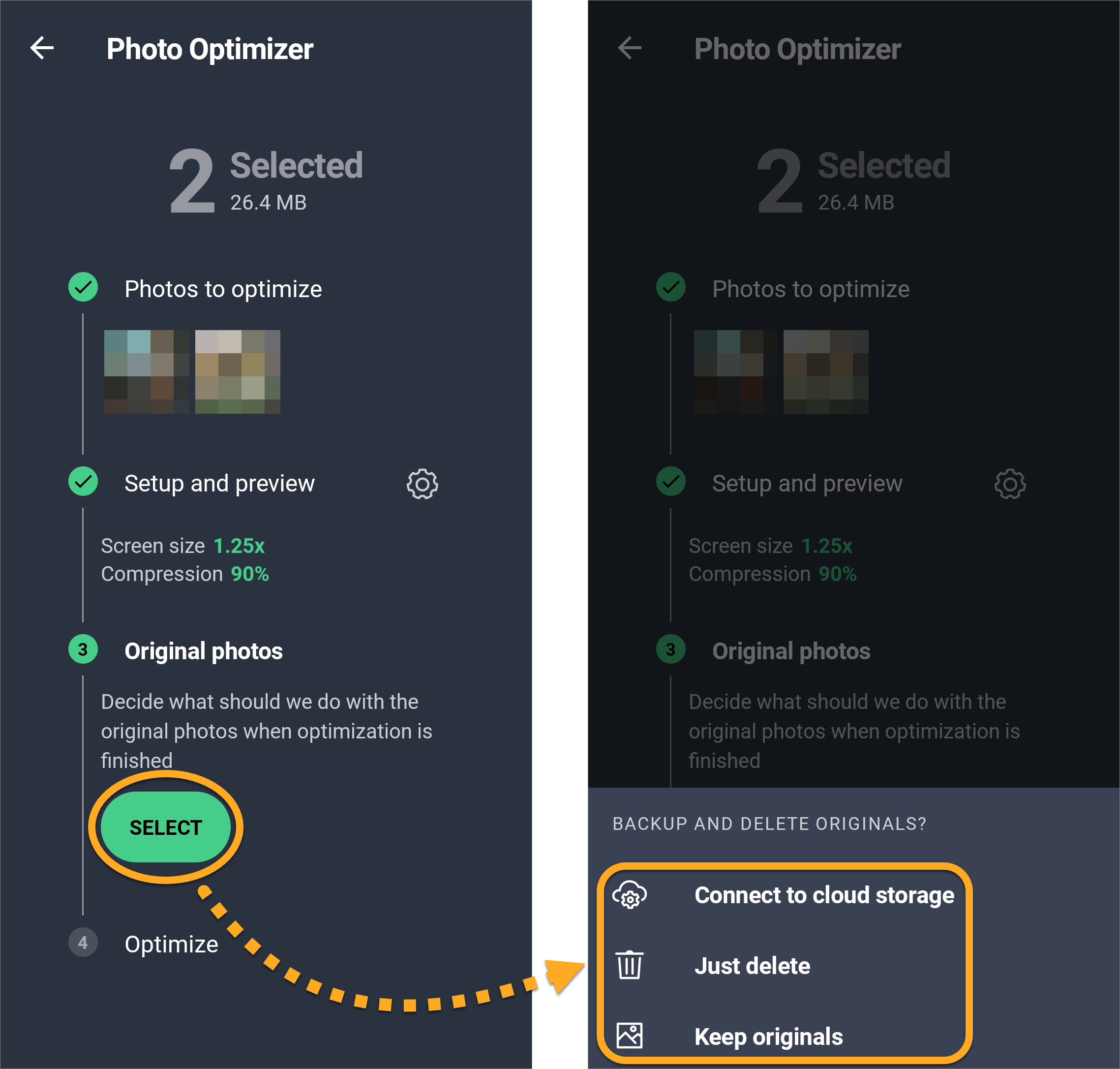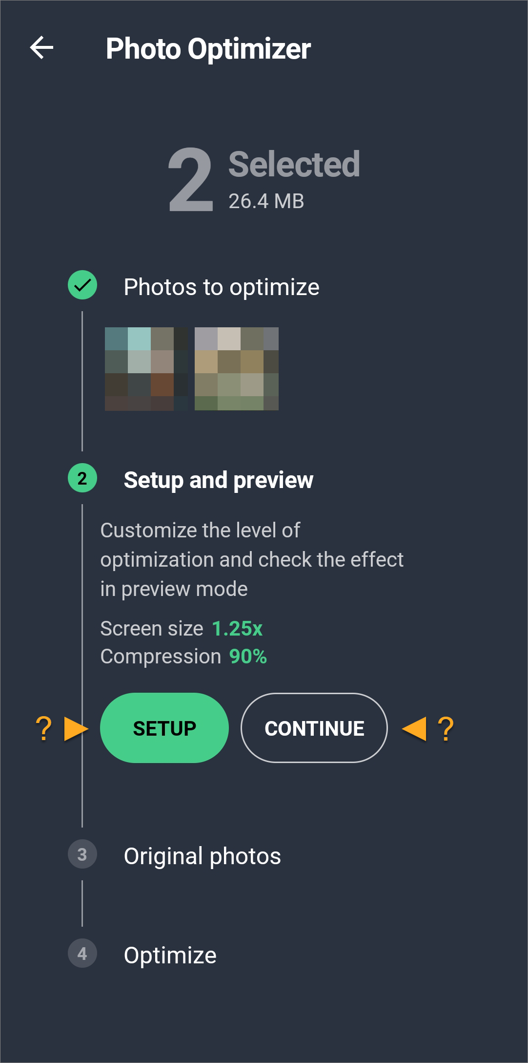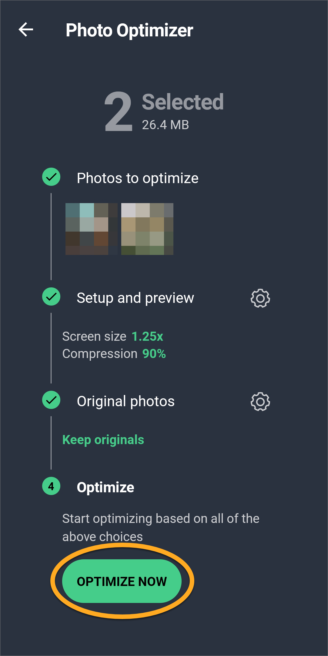 - Toque Optimícela ya para comenzar inmediatamente a optimizar las fotos seleccionadas.