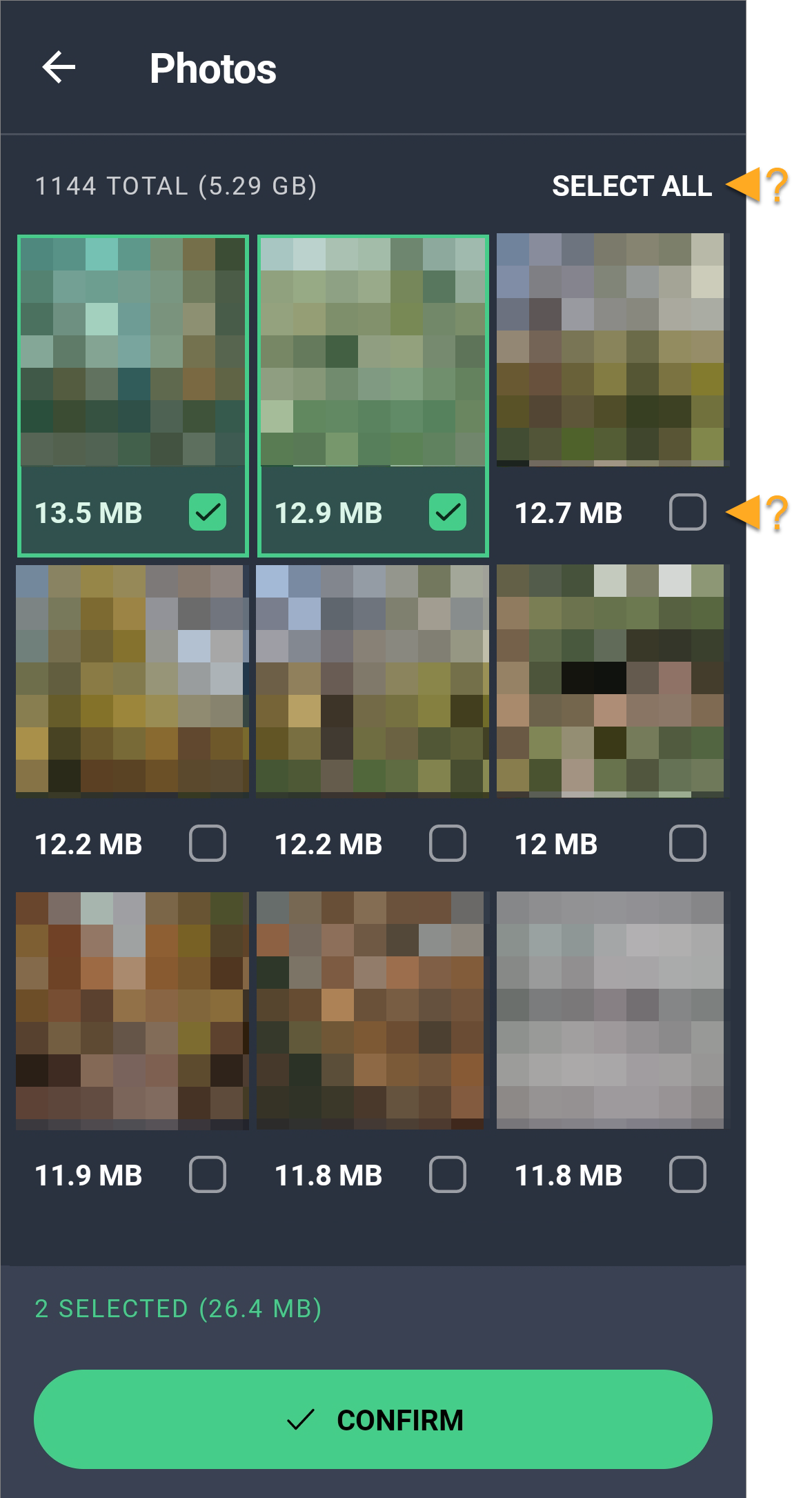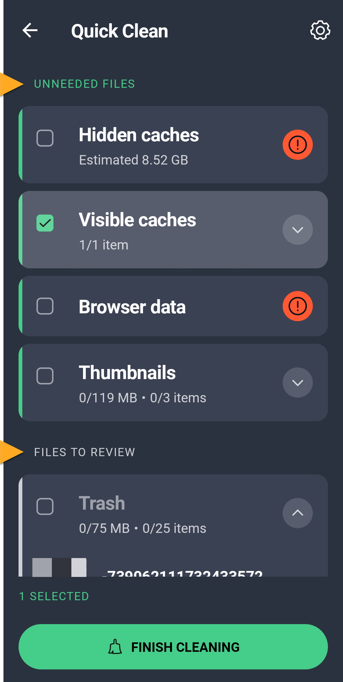 - Archivos innecesarios: datos que se han seleccionado cuidadosamente para asegurar que son prescindibles, incluidos miniaturas, APK, archivos residuales y la caché oculta, visible y compartida.