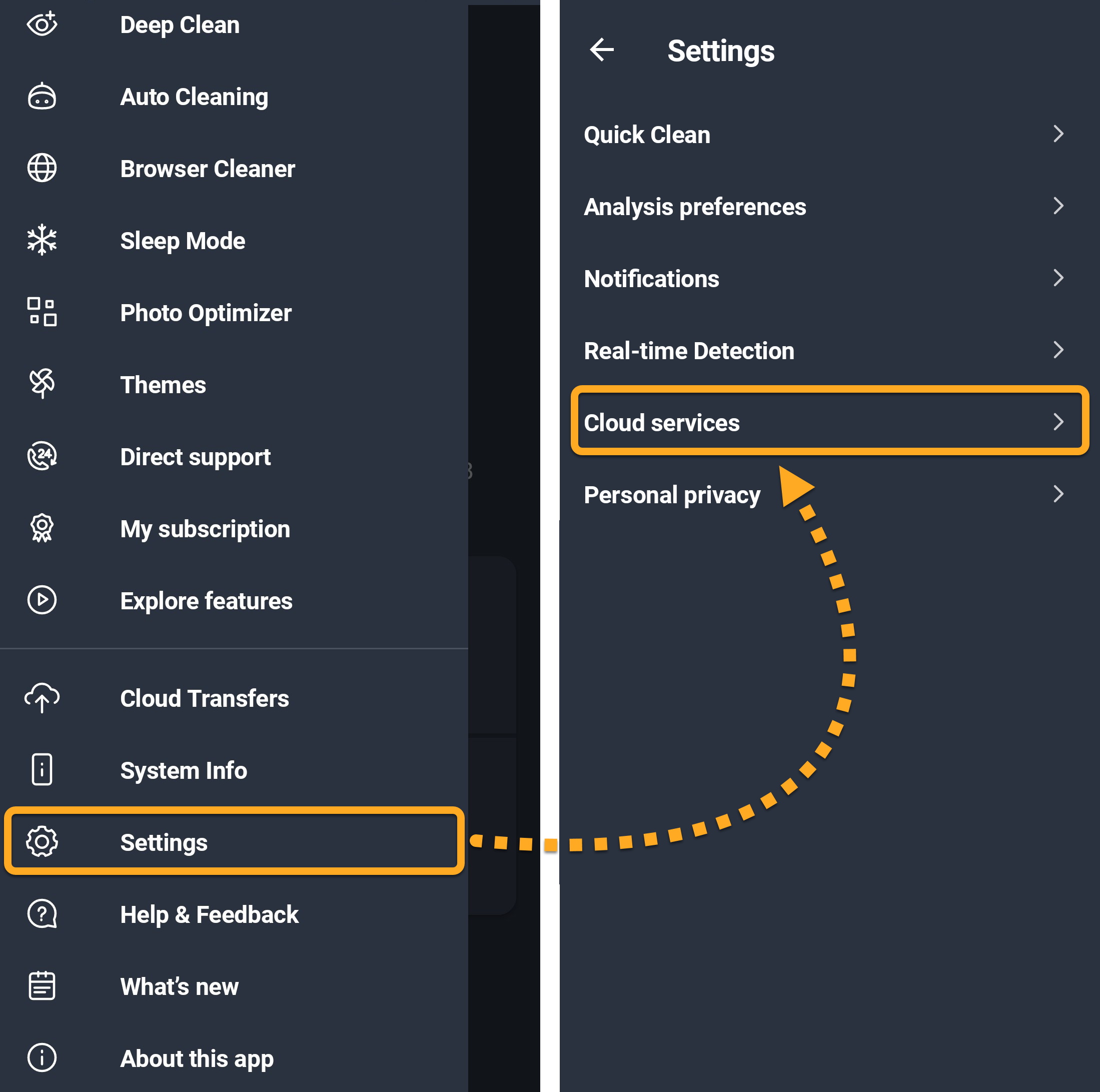 «La nube» hace referencia al espacio de almacenamiento virtual en el que puede guardar archivos multimedia y de otros tipos, como fotos, vídeos y documentos. AVG Cleaner le permite transferir fácilmente elementos del dispositivo a una cuenta de almacenamiento en la nube conectada. Para conectar AVG Cleaner a una cuenta de almacenamiento en la nube: