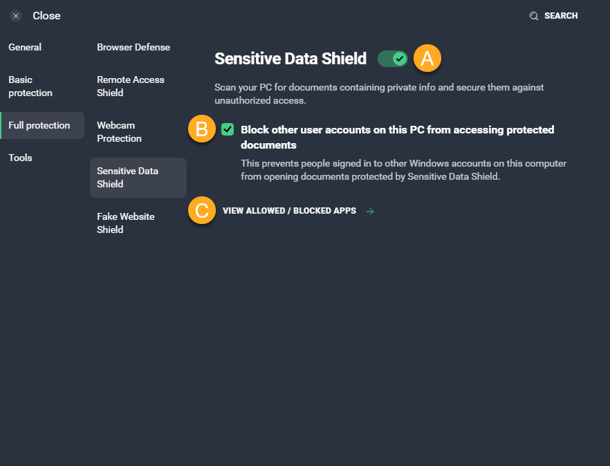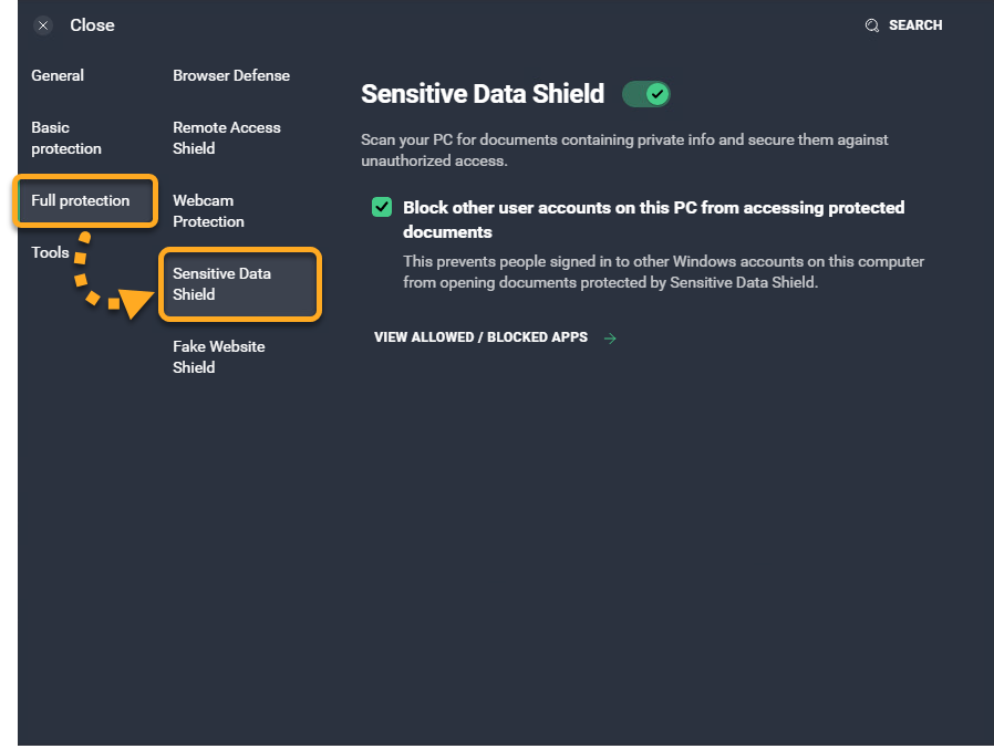- Asegúrate de que en el panel izquierdo esté seleccionado Protección completa ▸ Escudo de datos confidenciales.