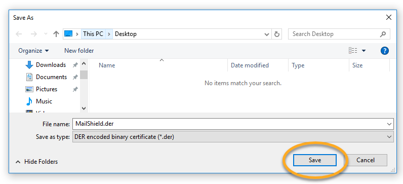 - Sélectionnez un emplacement dans lequel enregistrer le certificat de l’Agent e-mail exporté (par exemple, le bureau Windows) et cliquez sur Enregistrer.