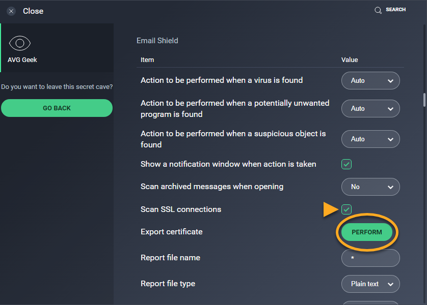 - Faites défiler jusqu'à la section Agent e-mail. Assurez-vous que la case en regard de analyser les connexions SSL est cochée, puis cliquez sur Exécuter en regard de Exporter le certificat.