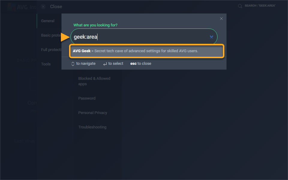 geek:areadans la zone de texte et sélectionnez AVG Geek dans les résultats de la recherche.