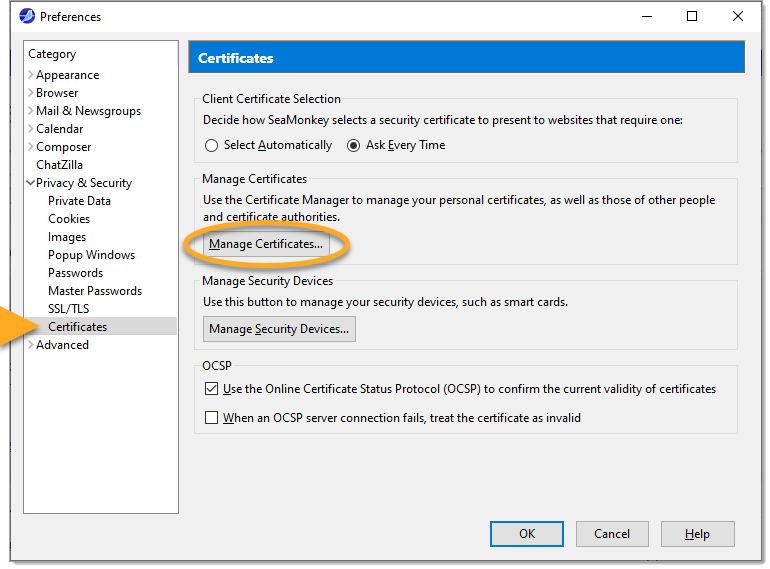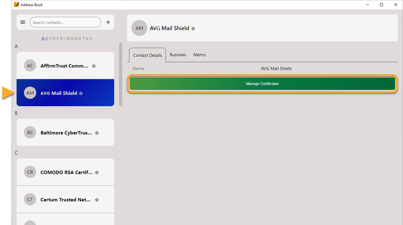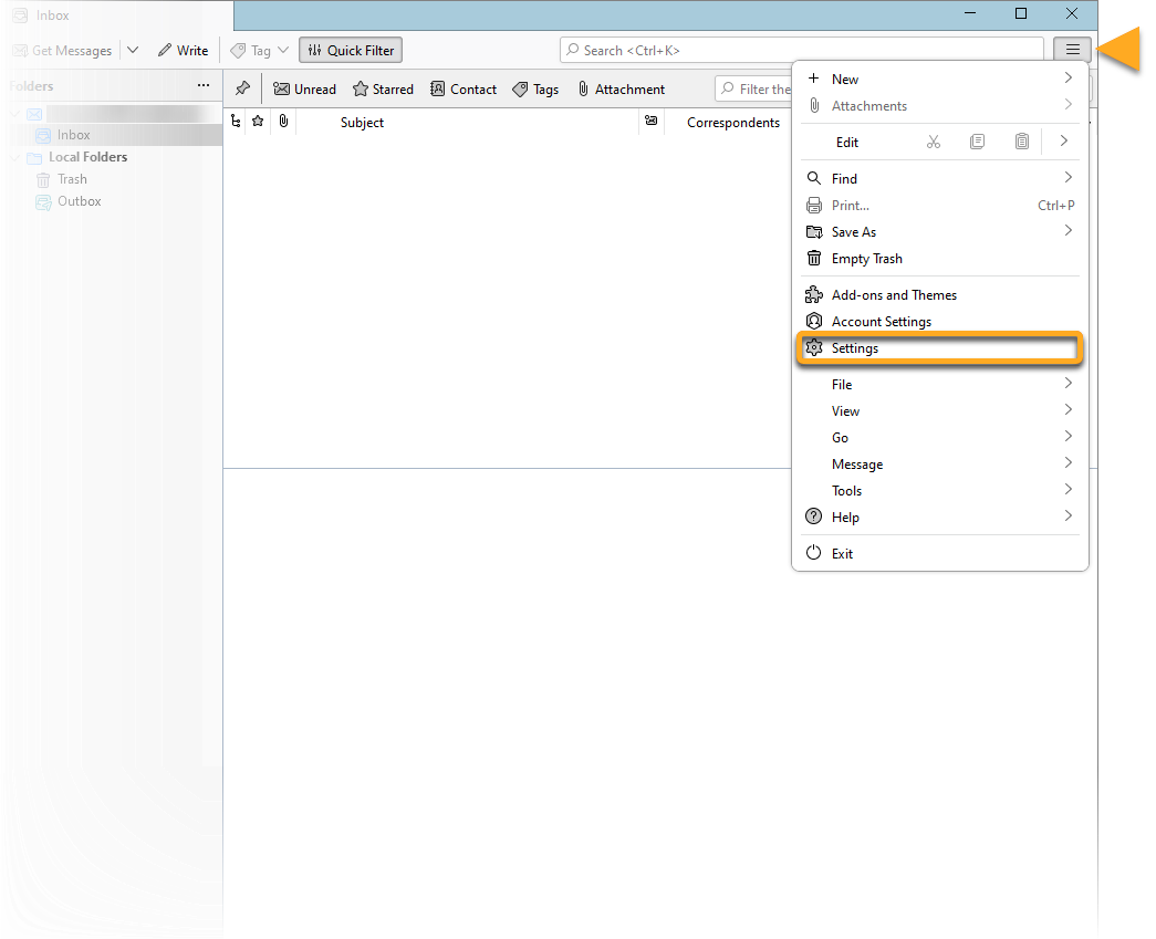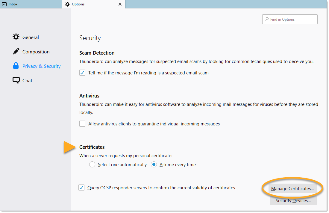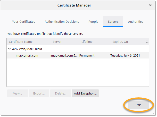 Pour Mozilla Thunderbird, SeaMonkey et The Bat!, suivez les étapes ci-dessous pour éviter les avertissements concernant les certificats de serveur de messagerie non valides en exportant le certificat de l’Agent e-mail, puis en l’important dans le magasin de certificats de votre client de messagerie.