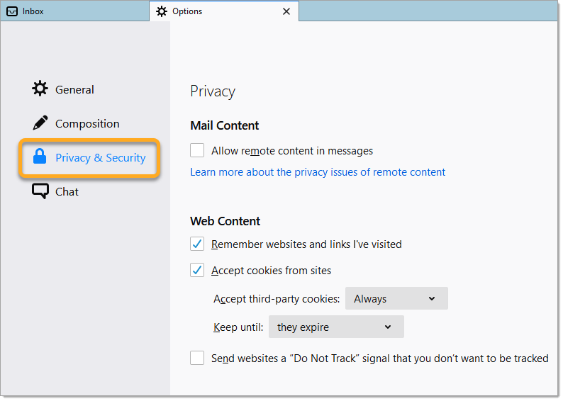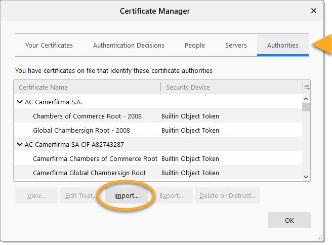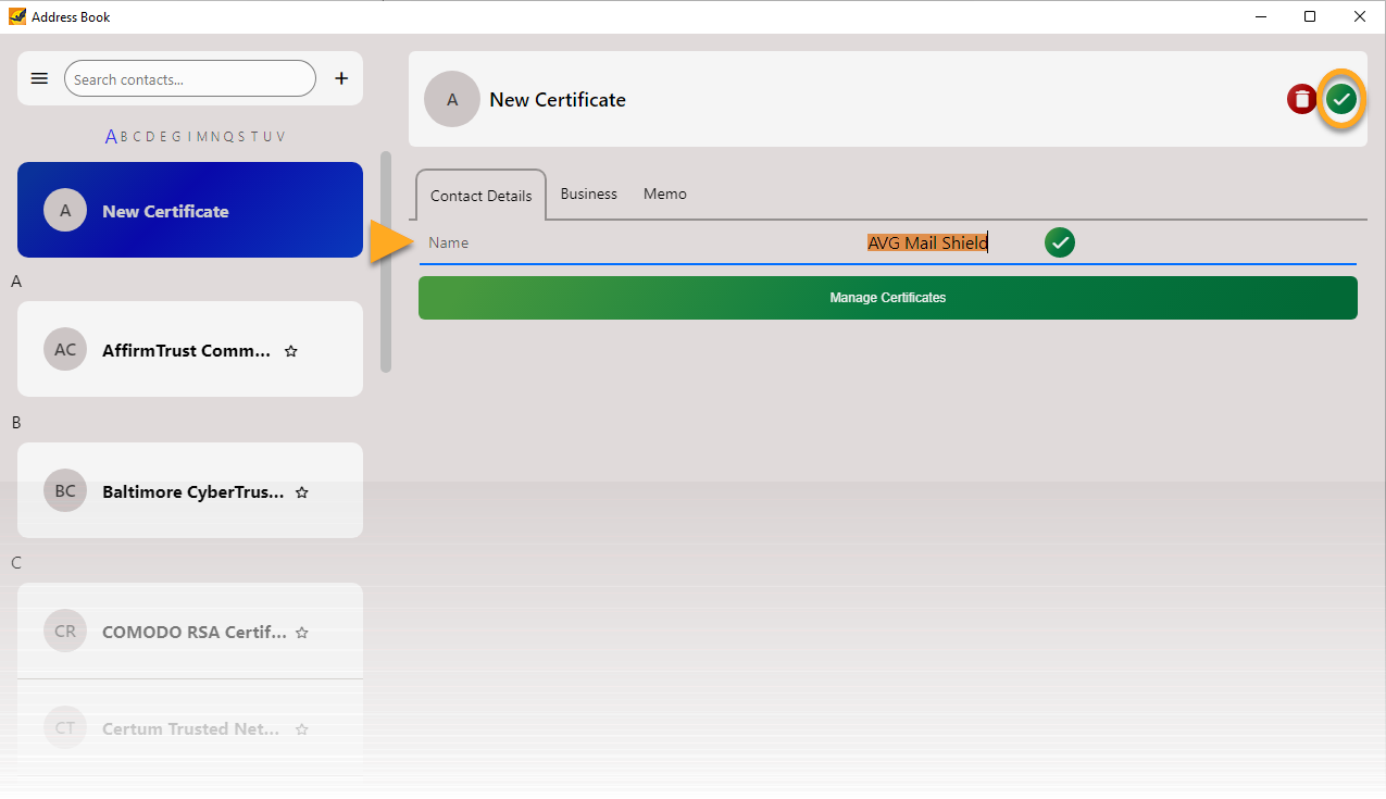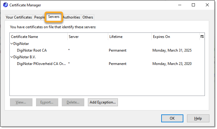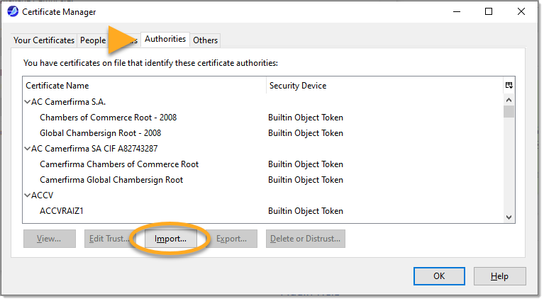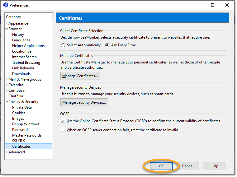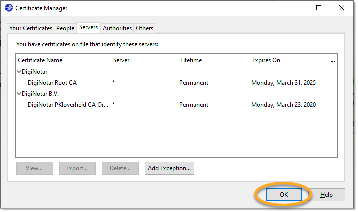 Pour Mozilla Thunderbird, SeaMonkey et The Bat!, suivez les étapes ci-dessous pour éviter les avertissements concernant les certificats de serveur de messagerie non valides en exportant le certificat de l’Agent e-mail, puis en l’important dans le magasin de certificats de votre client de messagerie.