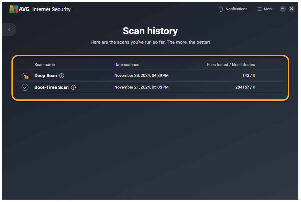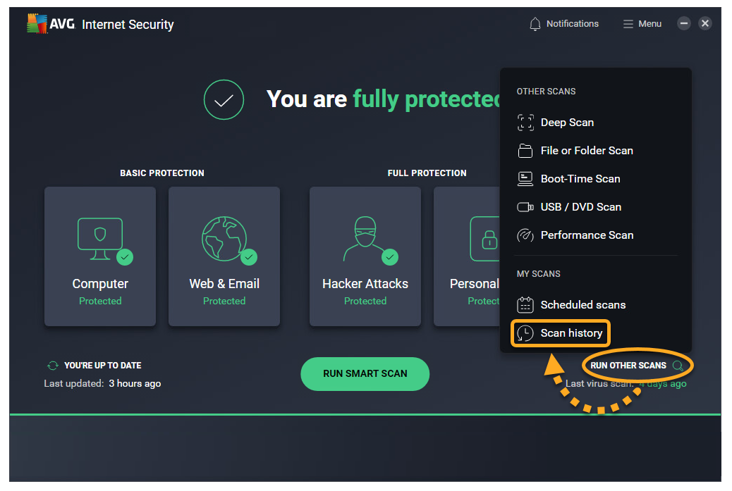 - Ouvrez AVG Antivirus et accédez à Exécuter d’autres analyses ▸ Historique d’analyse.