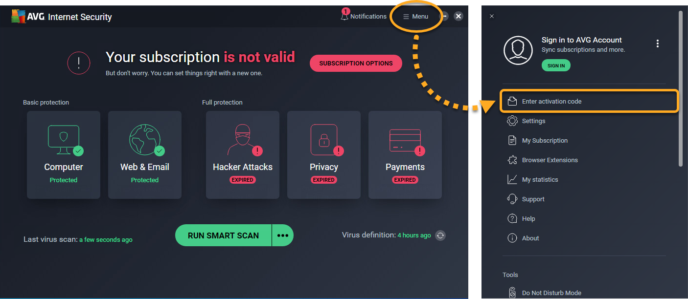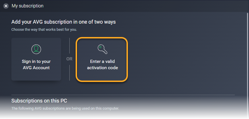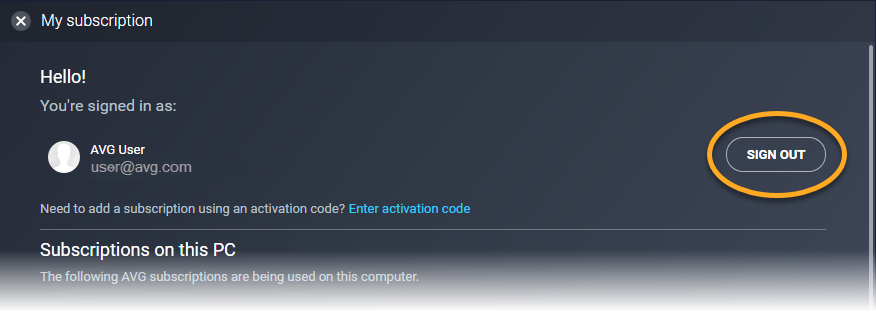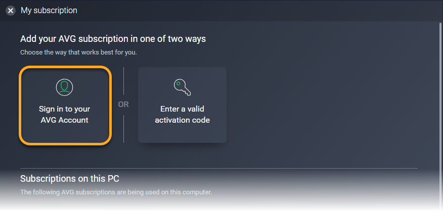 Nous vous conseillons de réactiver votre abonnement. Soit avec un code d’activation valide, soit en vous connectant à l’application avec votre Compte AVG (celui associé à l’adresse e-mail utilisée pour l’achat de l’abonnement).