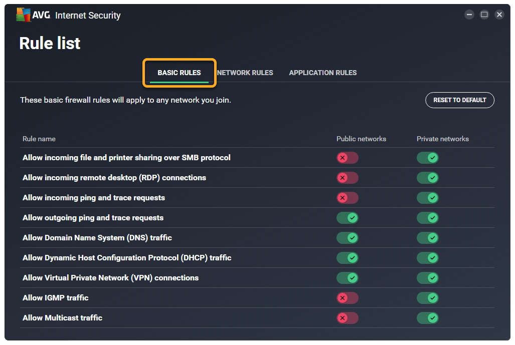 L’écran Règles basiques vous permet d’activer ou de désactiver chaque règle pour les profils réseau Public (non approuvé) et Privé (approuvé).