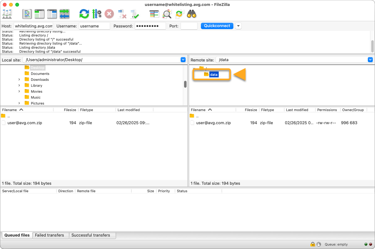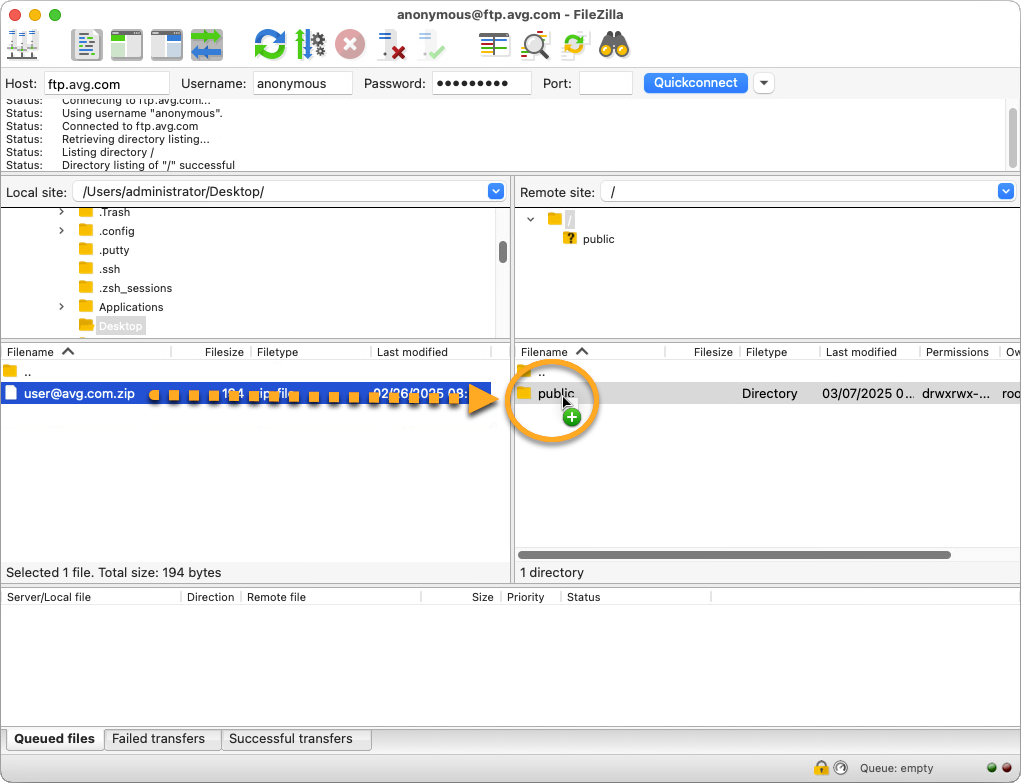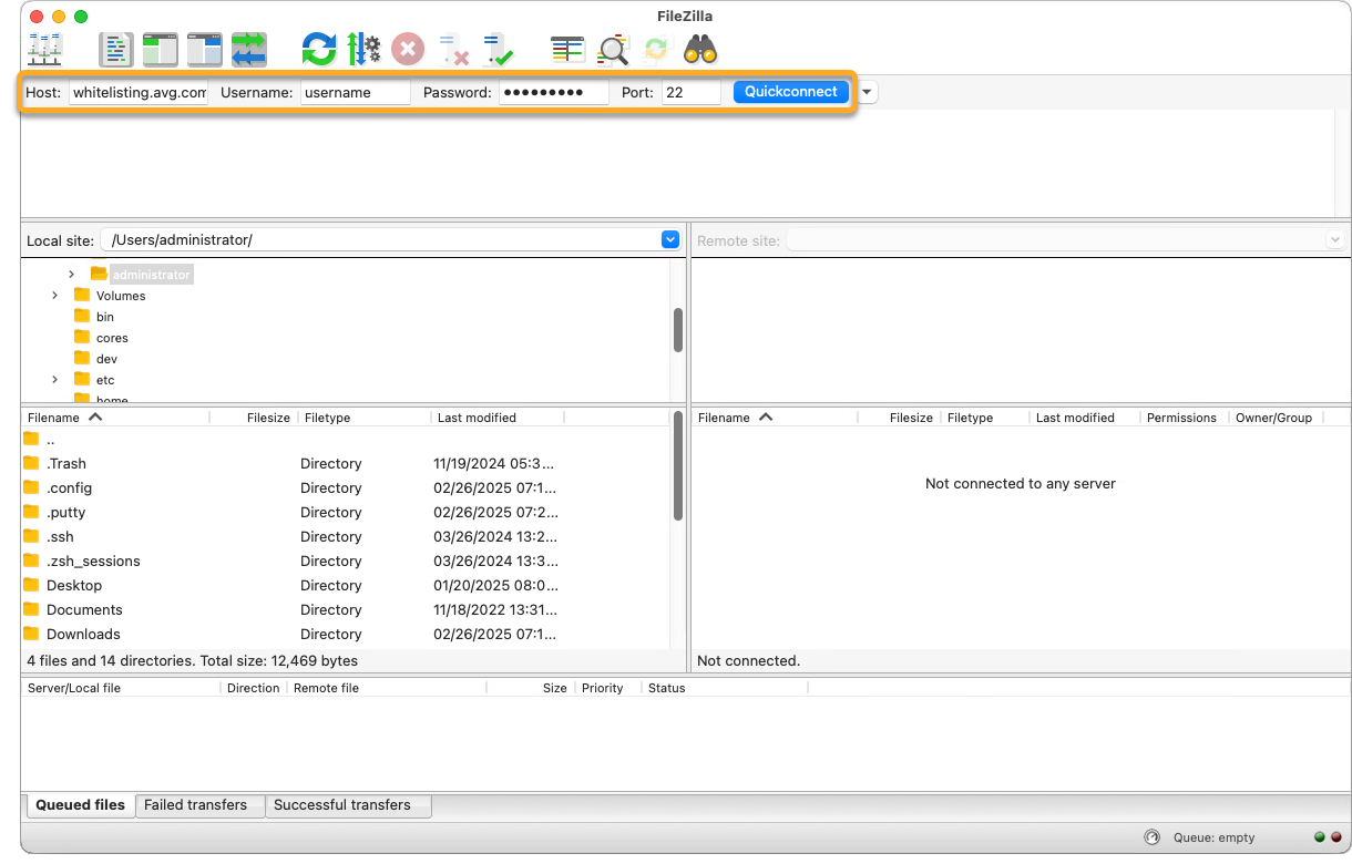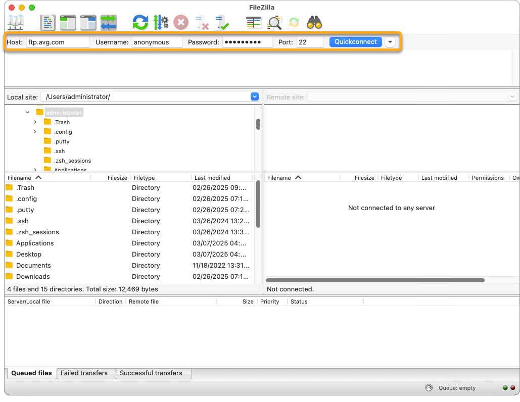 - Nel riquadro superiore specificare i parametri elencati sopra, quindi fare clic su Quickconnect (Connessione rapida) per connettersi al server FTP di AVG.