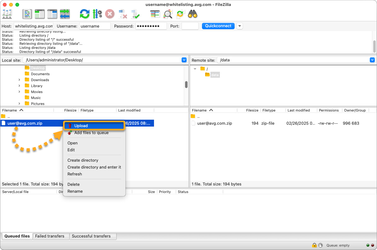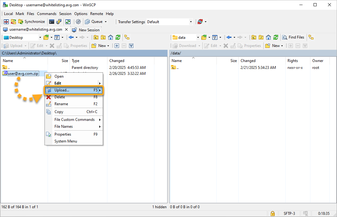 - Sul lato sinistro della schermata individuare il file zip con i file da inserire in lista bianca. Fare clic con il pulsante destro del mouse sull’archivio e selezionare Upload (Carica).