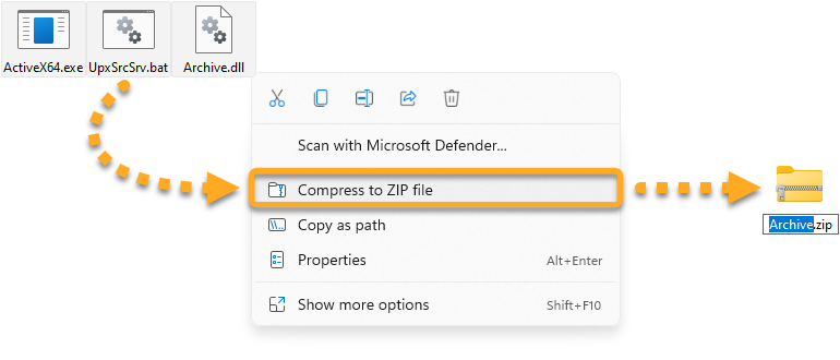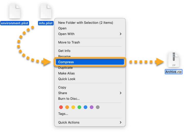 - Selezionare i file da caricare, fare clic con il pulsante destro del mouse e quindi scegliere Comprimi dal menu di scelta rapida.
