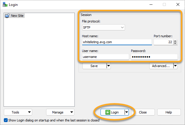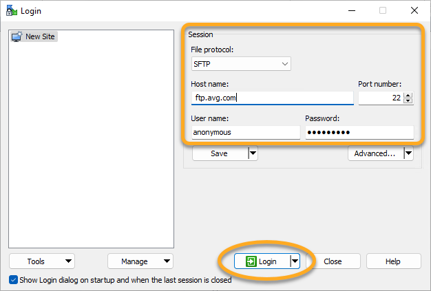 - Nella schermata Login (Accesso) specificare i parametri riportati sopra, quindi fare clic su Login (Accedi) per connettersi al server FTP di AVG.