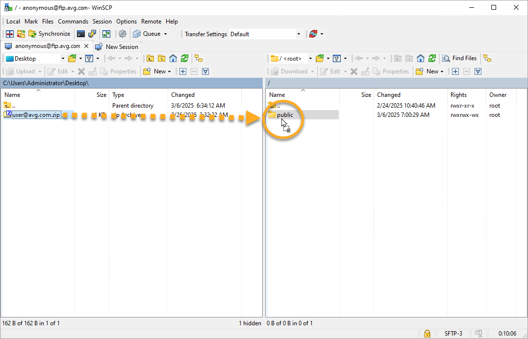 Quando si accede per la prima volta, si potrebbe vedere un messaggio pop-up riguardante una chiave host sconosciuta. Questo è un comportamento previsto e si può cliccare su OK. - Sul lato sinistro della schermata, individua il tuo file zip con i file per l'analisi. Trascinare e rilascia il file zip nella cartella public.