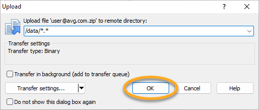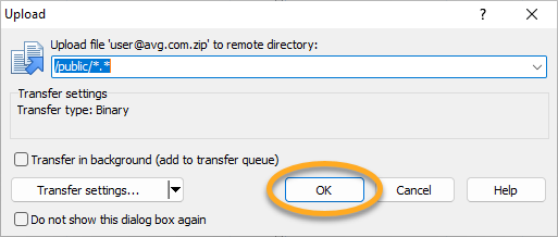 - Fare clic su OK per caricare i file sul server FTP di AVG.