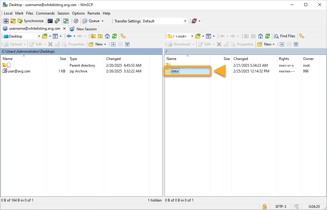 Quando si accede per la prima volta, si potrebbe vedere un messaggio pop-up riguardante una chiave host sconosciuta. Questo è un comportamento previsto e si può cliccare su OK. - Sul lato destro dello schermo, fare doppio clic sulla cartella dei dati.