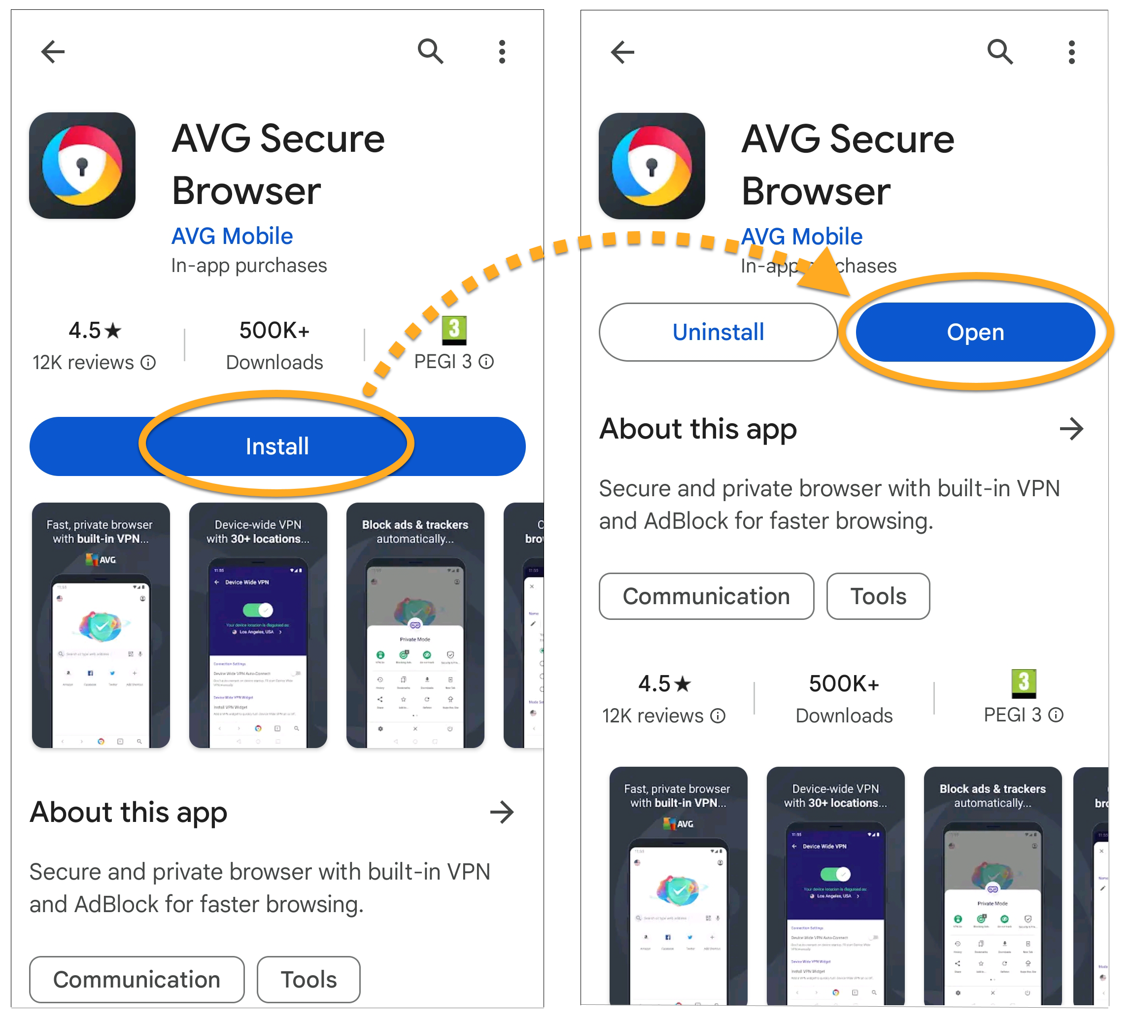 Vai a Google Play Store - Toccare Installa per scaricare e installare l'app. Al termine dell'installazione, toccare Apri per aprire AVG Secure Browser.