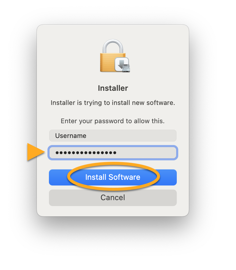 - Immettere la password utilizzata all'avvio del Mac e cliccare su Installa software.