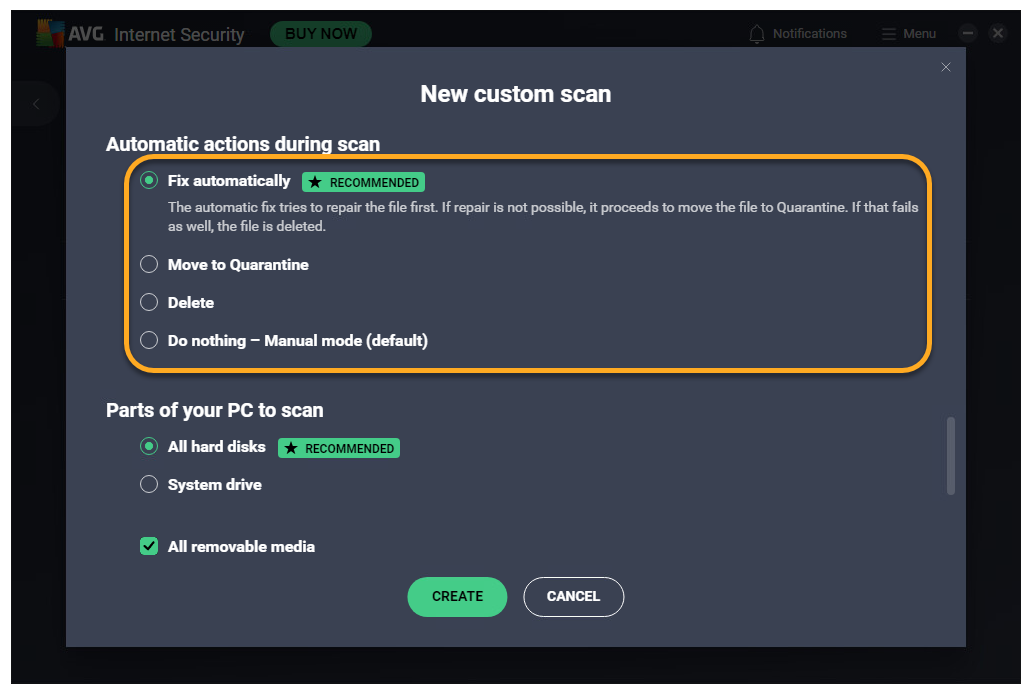 - Elimina: se viene rilevato un file infetto, AVG lo eliminerà automaticamente.