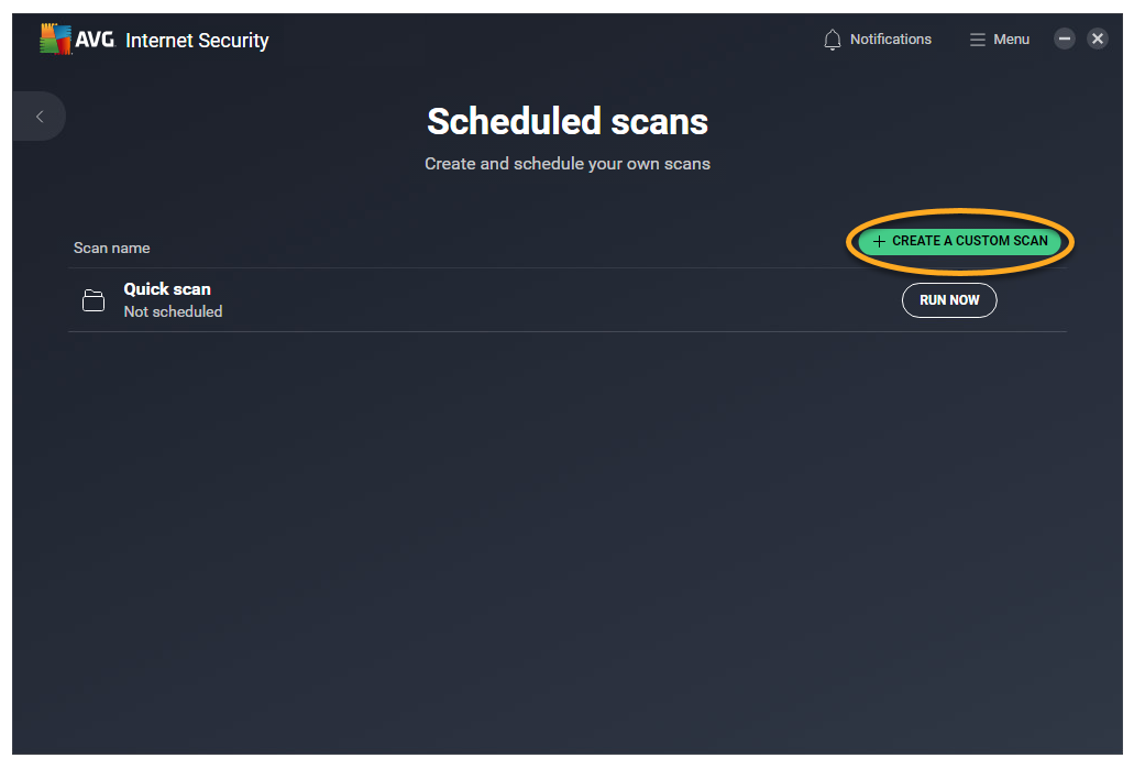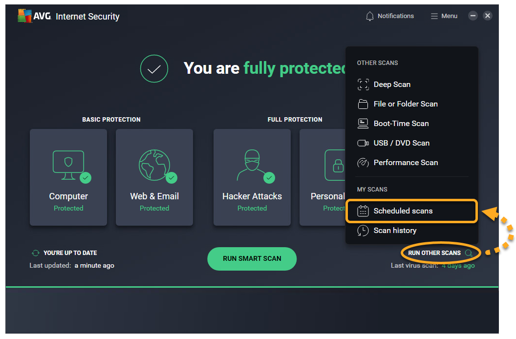 - Aprire AVG AntiVirus e passare a Esegui altre scansioni ▸ Scansioni pianificate.
